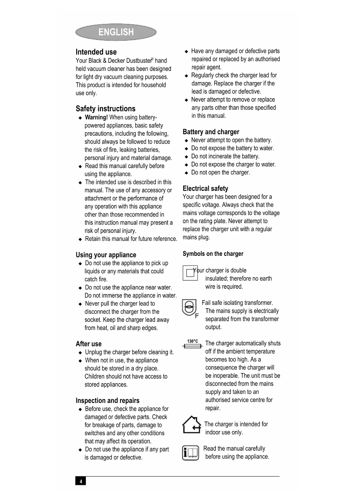 hand held vacuum cleaner has been designed for light dry vacuum cleaning purposes. This product is intended for household use only. Safety instructions Warning! When using battery- powered appliances, basic safety precautions, including the following, should always be followed to reduce the risk of fire, leaking batteries, personal injury and material damage. Read this manual carefully before using the appliance. The intended use is described in this manual. The use of any accessory or attachment or the performance of any operation with this appliance other than those recommended in this instruction manual may present a risk of personal injury. Retain this manual for future reference. Using your appliance Do not use the appliance to pick up liquids or any materials that could catch fire. Do not use the appliance near water. Do not immerse the appliance in water. Never pull the charger lead to disconnect the charger from the socket. Keep the charger lead away from heat, oil and sharp edges. After use Unplug the charger before cleaning it. When not in use, the appliance should be stored in a dry place. Children should not have access to stored appliances. Inspection and repairs Before use, check the appliance for damaged or defective parts. Check for breakage of parts, damage to switches and any other conditions that may affect its operation. Do not use the appliance if any part is damaged or defective. Have any damaged or defective parts repaired or replaced by an authorised repair agent. Regularly check the charger lead for damage. Replace the charger if the lead is damaged or defective. Never attempt to remove or replace any parts other than those specified in this manual. Battery and charger Never attempt to open the battery. Do not expose the battery to water. Do not incinerate the battery. Do not expose the charger to water. Do not open the charger. Electrical safety Your charger has been designed for a specific voltage. Always check that the mains voltage corresponds to the voltage on the rating plate. Never attempt to replace the charger unit with a regular mains plug. Symbols on the charger