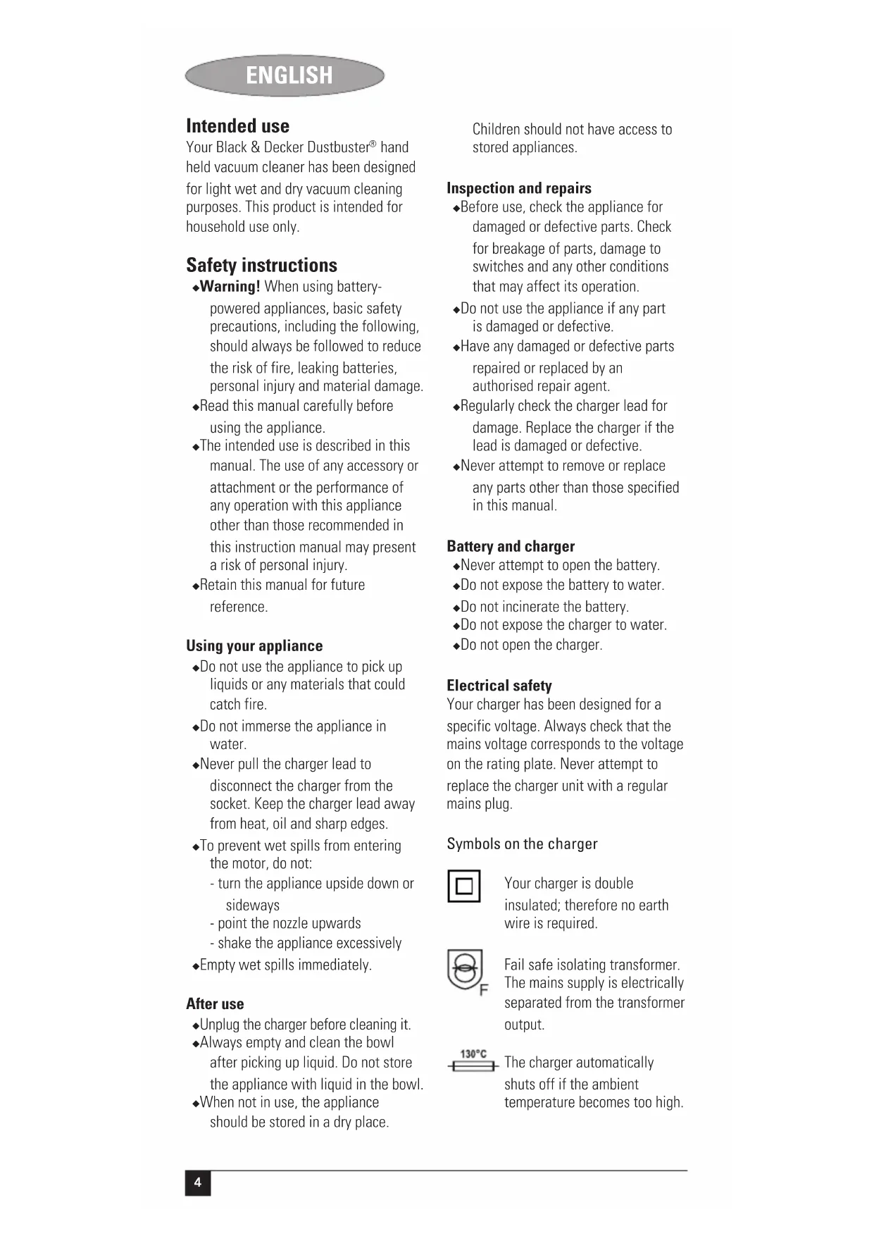 hand held vacuum cleaner has been designed for light wet and dry vacuum cleaning purposes. This product is intended for household use only. Safety instructions ◆ Warning! When using battery- powered appliances, basic safety precautions, including the following, should always be followed to reduce the risk of fire, leaking batteries, personal injury and material damage. ◆ Read this manual carefully before using the appliance. ◆ The intended use is described in this manual. The use of any accessory or attachment or the performance of any operation with this appliance other than those recommended in this instruction manual may present a risk of personal injury. ◆ Retain this manual for future reference. Using your appliance ◆ Do not use the appliance to pick up liquids or any materials that could catch fire. ◆ Do not immerse the appliance in water. ◆ Never pull the charger lead to disconnect the charger from the socket. Keep the charger lead away from heat, oil and sharp edges. ◆ To prevent wet spills from entering the motor, do not: - turn the appliance upside down or sideways - point the nozzle upwards - shake the appliance excessively ◆ Empty wet spills immediately. After use ◆ Unplug the charger before cleaning it. ◆ Always empty and clean the bowl after picking up liquid. Do not store the appliance with liquid in the bowl. ◆ When not in use, the appliance should be stored in a dry place. Children should not have access to stored appliances. Inspection and repairs ◆ Before use, check the appliance for damaged or defective parts. Check for breakage of parts, damage to switches and any other conditions that may affect its operation. ◆ Do not use the appliance if any part is damaged or defective. ◆ Have any damaged or defective parts repaired or replaced by an authorised repair agent. ◆ Regularly check the charger lead for damage. Replace the charger if the lead is damaged or defective. ◆ Never attempt to remove or replace any parts other than those specified in this manual. Battery and charger ◆ Never attempt to open the battery. ◆ Do not expose the battery to water. ◆ Do not incinerate the battery. ◆ Do not expose the charger to water. ◆ Do not open the charger. Electrical safety Your charger has been designed for a specific voltage. Always check that the mains voltage corresponds to the voltage on the rating plate. Never attempt to replace the charger unit with a regular mains plug. Symbols on the charger Your charger is double insulated; therefore no earth wire is required. Fail safe isolating transformer. The mains supply is electrically separated from the transformer output. The charger automatically shuts off if the ambient temperature becomes too high.5 ENGLISH As soon as the ambient temperature has decreased, the charger will resume operating. The charger is intended for indoor use only. Read the manual carefully before using the appliance. Features