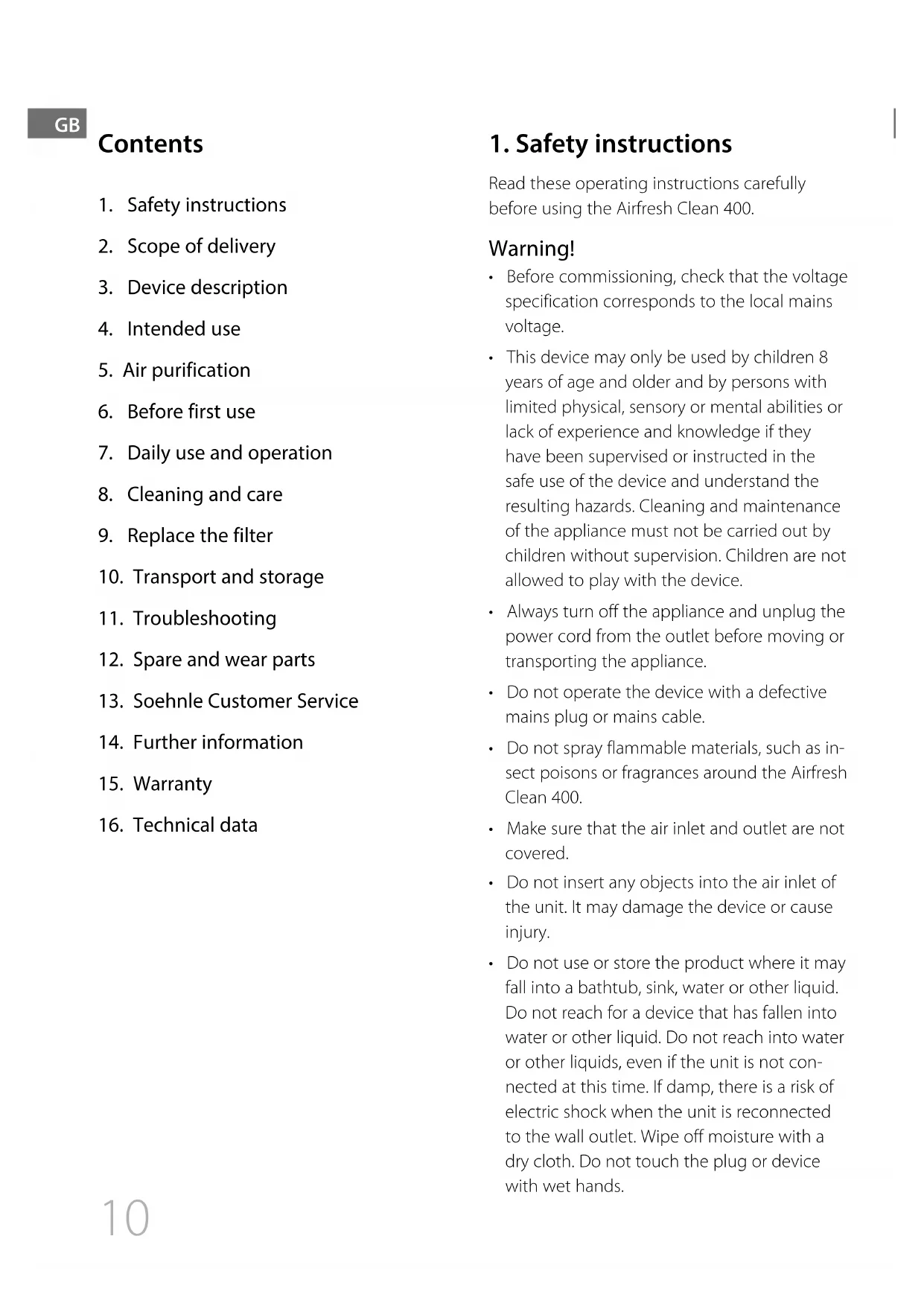 - Only use the original Soehnle filter, which is specially designed for this Airfresh Clean 400.