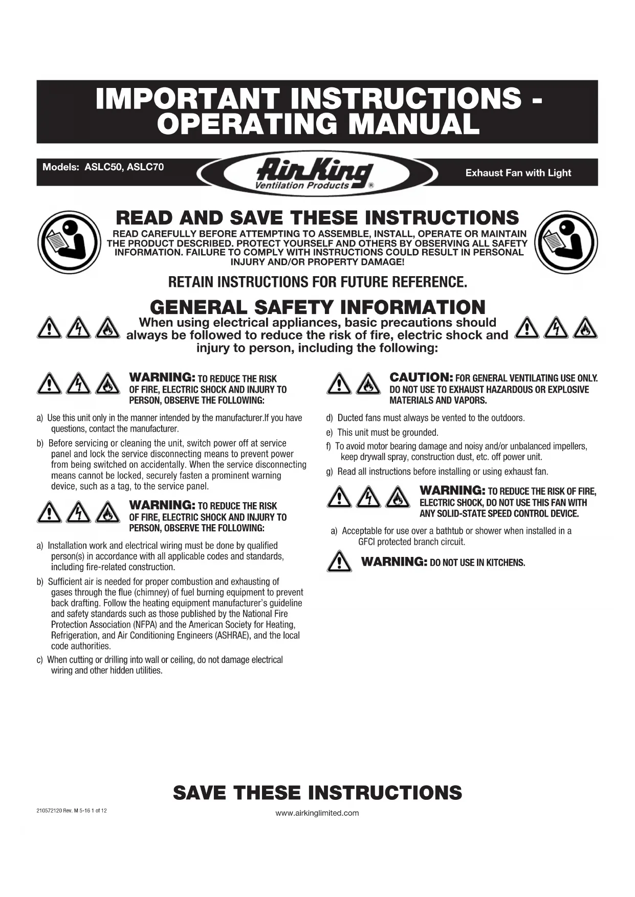 www.airkinglimited.com210572120 Rev. M 5-16 1 of 12 Exhaust Fan with Light Models: ASLC50, ASLC70