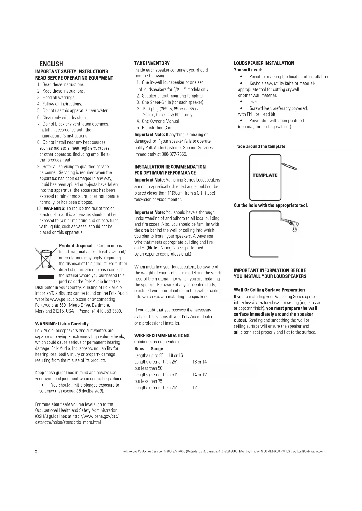 Important Note: Vanishing Series Loudspeakers are not magnetically shielded and should not be placed closer than 1’ (30cm) from a CRT (tube) television or video monitor. Important Note:Youshouldhaveathorough understanding of and adhere to all local building and fire codes. Also, you should be familiar with the area behind the wall or ceiling into which you plan to install your speakers. Always use wire that meets appropriate building and fire codes. (Note: Wiring is best performed by an experienced professional.) When installing your loudspeakers, be aware of the weight of your particular model and the sturdi- ness of the material into which you are installing the speaker. Be aware of any concealed studs, electrical wiring or plumbing in the wall or ceiling into which you are installing the speakers. If you doubt that you possess the necessary skills or tools, consult your Polk Audio dealer or a professional installer. WIRE RECOMMENDATIONS (minimum recommended) Runs Gauge Lengths up to 25' 18 or 16 Lengths greater than 25' 16 or 14 but less than 50' Lengths greater than 50' 14 or 12 but less than 75' Lengths greater than 75' 12 LOUDSPEAKER INSTALLATION You will need: