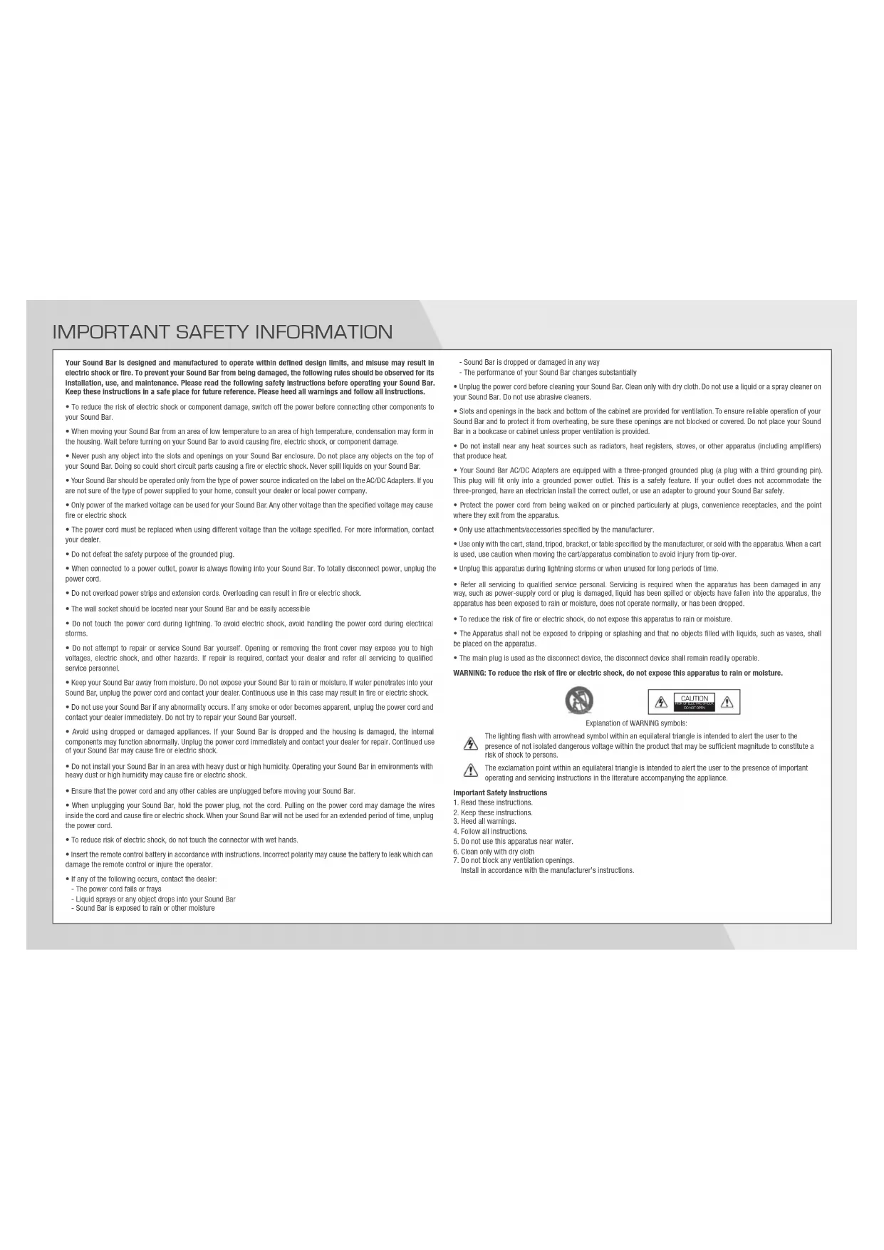 - Only power of the marked voltage can be used for your Sound Bar. Any other voltage than the specified voltage may cause fire or electric shock