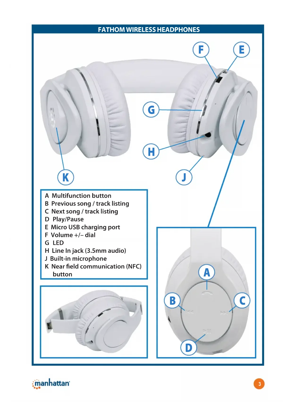 A Multifunction button B Previous song / track listing C Next song / track listing D Play/Pause E Micro USB charging port F Volume +/– dial G LED H Line In jack (3.5mm audio) J Built-in microphone K Near field communication (NFC) button4 ENGLISH Initial Setup Connecting You can connect the headphones two ways to enjoy audio: