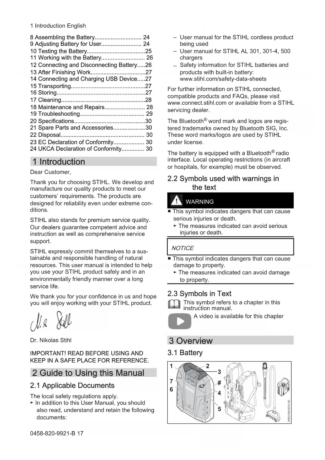 - 24 UKCA Declaration of Conformity 1 Introduction Dear Customer, Thank you for choosing STIHL. We develop and manufacture our quality products to meet our customers’ requirements. The products are designed for reliability even under extreme con‐ ditions. STIHL also stands for premium service quality. Our dealers guarantee competent advice and instruction as well as comprehensive service support. STIHL expressly commit themselves to a sus‐ tainable and responsible handling of natural resources. This user manual is intended to help you use your STIHL product safely and in an environmentally friendly manner over a long service life. We thank you for your confidence in us and hope you will enjoy working with your STIHL product. Dr. Nikolas Stihl p. 30