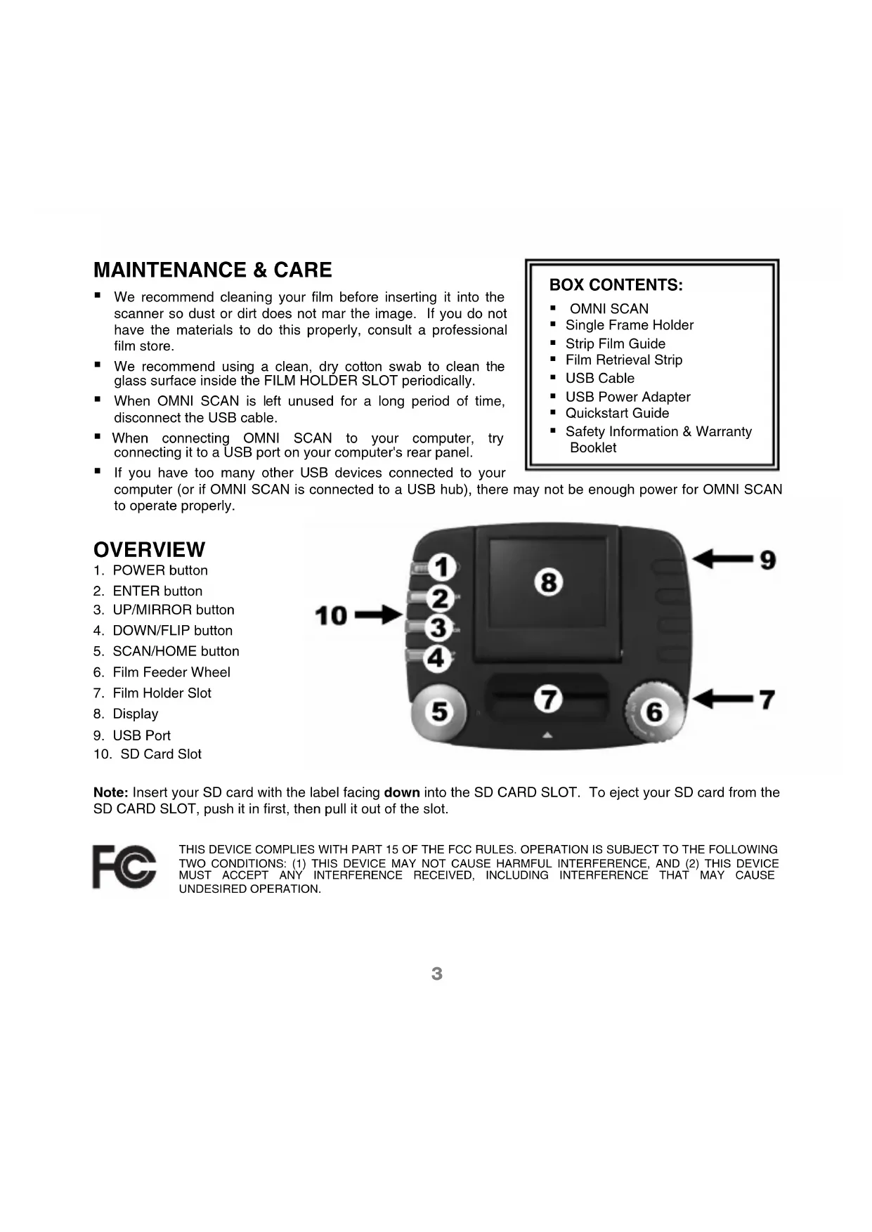 Note: Insert your SD card with the label facing down into the SD CARD SLOT. To eject your SD card from the SD CARD SLOT, push it in first, then pull it out of the slot. THIS DEVICE COMPLIES WITH PART 15 OF THE FCC RULES. OPERATION IS SUBJECT TO THE FOLLOWING TWO CONDITIONS: (1) THIS DEVICE MAY NOT CAUSE HARMFUL INTERFERENCE, AND (2) THIS DEVICE MUST ACCEPT ANY INTERFERENCE RECEIVED, INCLUDING INTERFERENCE THAT MAY CAUSE UNDESIRED OPERATION. BOX CONTENTS: