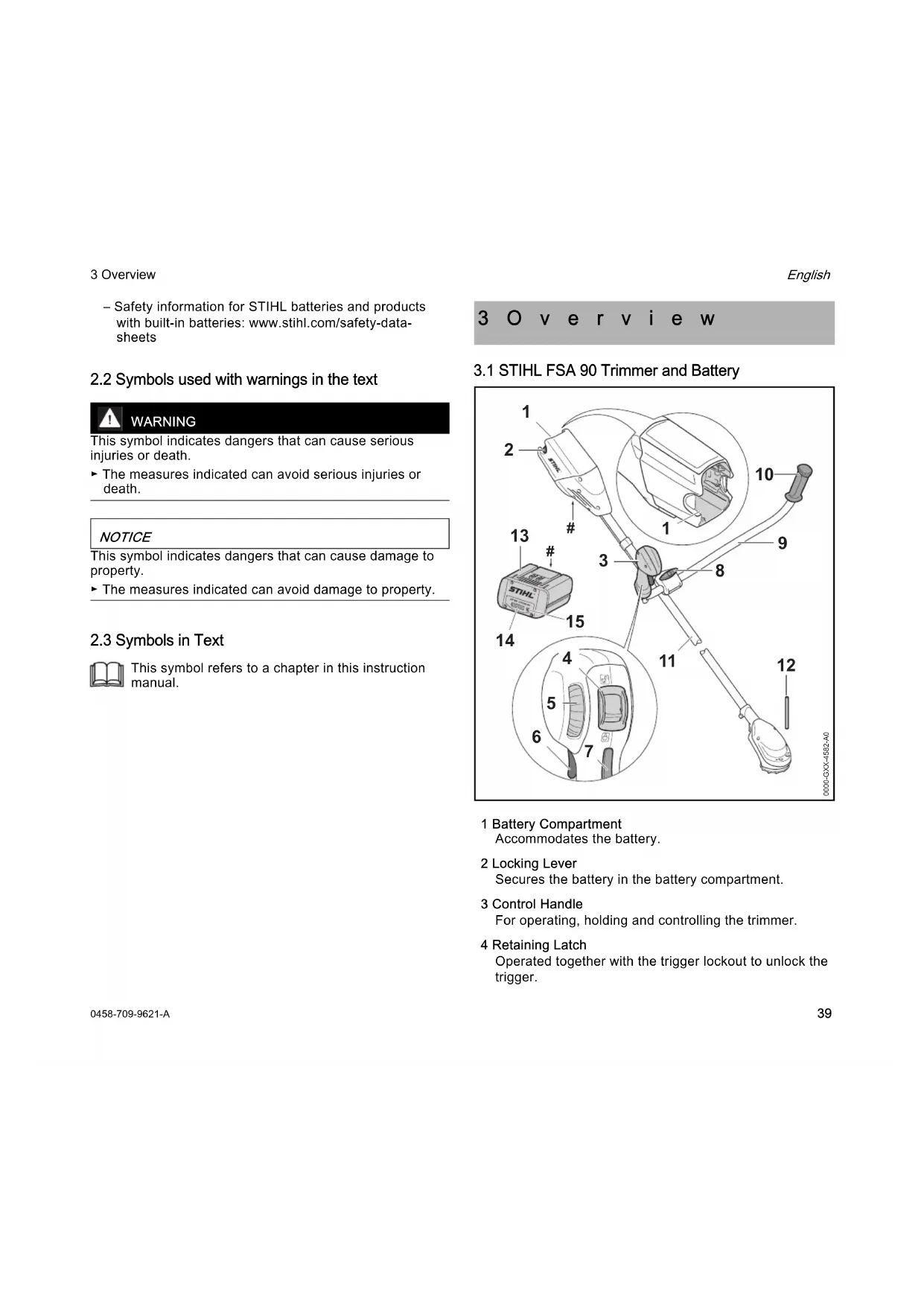 English 3 Overview– Safety information for STIHL batteries and products with built-in batteries: www.stihl.com/safety-data-sheets