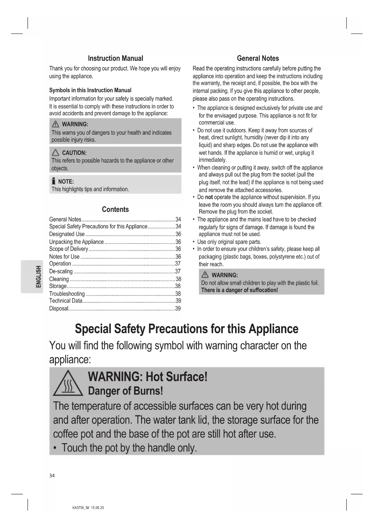Technical Data Model:........................................................................KA 3756 Power supply:.....................................220 - 240 V~, 50 - 60 Hz Power consumption: .....................................................800 W Filling quantity: ...............................................approx. 1.2 litre Protection class: ..................................................................... Net weight: ..................................................... approx. 1.85 kg The right to make technical and design modications in the course of continuous product development remains reserved. This appliance has been tested according to all relevant current CE guidelines, such as electromagnetic compatibility and low voltage directives, and is manufactured according to the latest safety regulations. Disposal Meaning of the “Dustbin” Symbol Protect our environment: do not dispose of electrical equipment in the domestic waste. Please return any electrical equipment that you will no longer use to the collection points provided for their disposal. This helps avoid the potential effects of incorrect disposal on the environment and human health. This will contribute to the recycling and other forms of re-utilisation of electrical and electronic equipment. Information concerning where the equipment can be dis- posed of can be obtained from your local authority.KA3756_IM 15.06.20