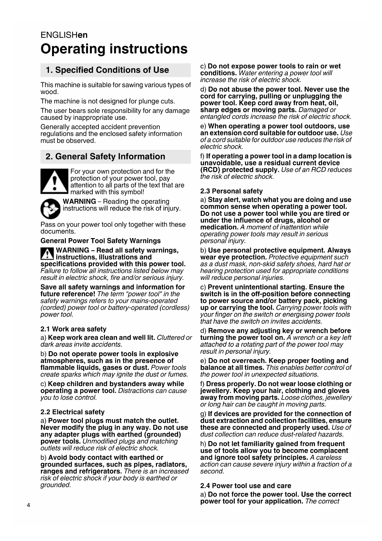 Operating instructions This machine is suitable for sawing various types of wood. The machine is not designed for plunge cuts. The user bears sole responsibility for any damage caused by inappropriate use. Generally accepted accident prevention regulations and the enclosed safety information must be observed. For your own protection and for the protection of your power tool, pay attention to all parts of the text that are marked with this symbol! WARNING – Reading the operating instructions will reduce the risk of injury. Pass on your power tool only together with these documents. General Power Tool Safety Warnings WARNING – Read all safety warnings, instructions, illustrations and specifications provided with this power tool. Failure to follow all instructions listed below may result in electric shock, fire and/or serious injury. Save all safety warnings and information for future reference! The term "power tool" in the safety warnings refers to your mains-operated (corded) power tool or battery-operated (cordless) power tool.