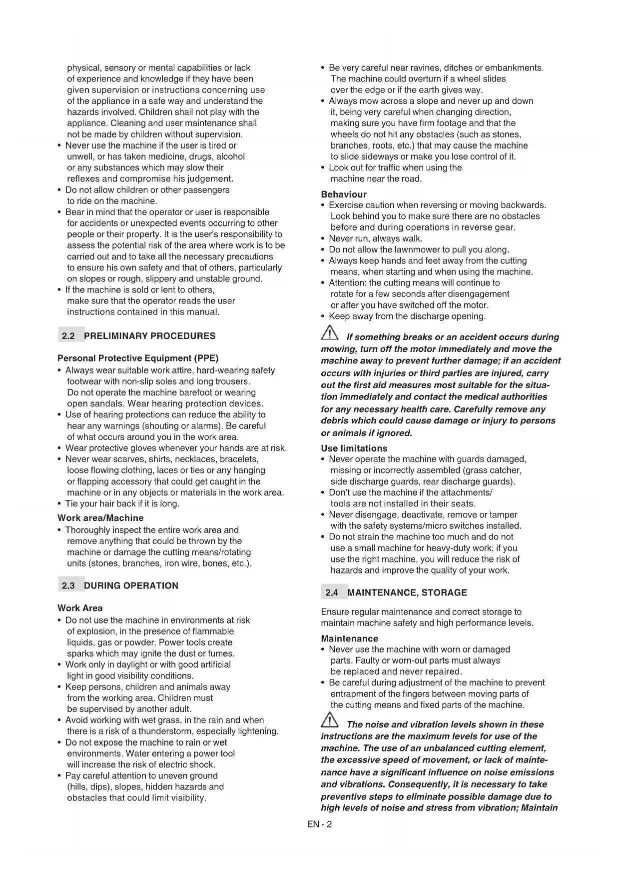 - Be careful during adjustment of the machine to prevent entrapment of the ngers between moving parts of the cutting means and xed parts of the machine. The noise and vibration levels shown in these instructions are the maximum levels for use of the machine. The use of an unbalanced cutting element, the excessive speed of movement, or lack of mainte- nance have a signicant inuence on noise emissions and vibrations. Consequently, it is necessary to take preventive steps to eliminate possible damage due to high levels of noise and stress from vibration; MaintainEN - 3 the machine well, wear ear protection devices, and take breaks while working. Storage