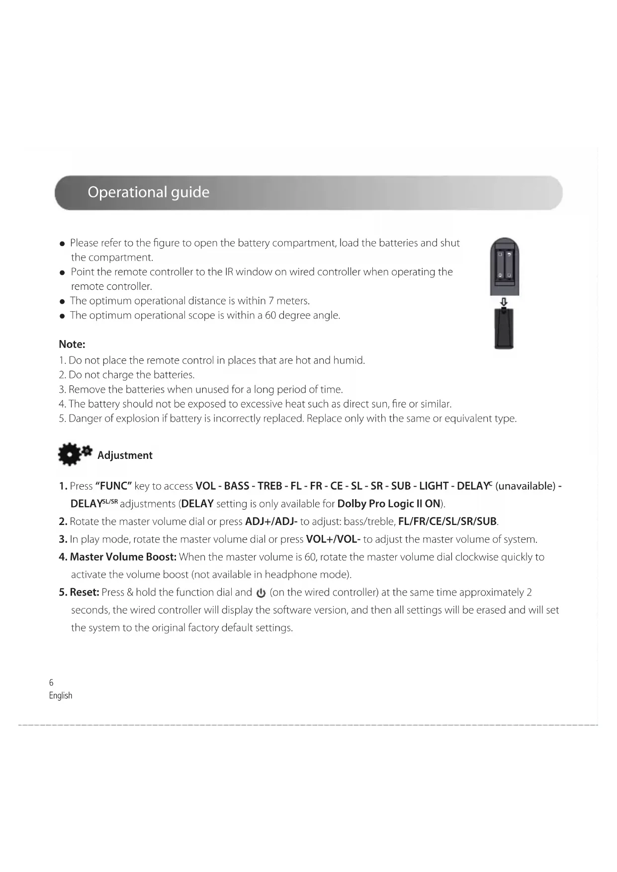 2. Rotate the master volume dial or press ADJ+/ADJ- to adjust: bass/treble, FL/FR/CE/SL/SR/SUB.