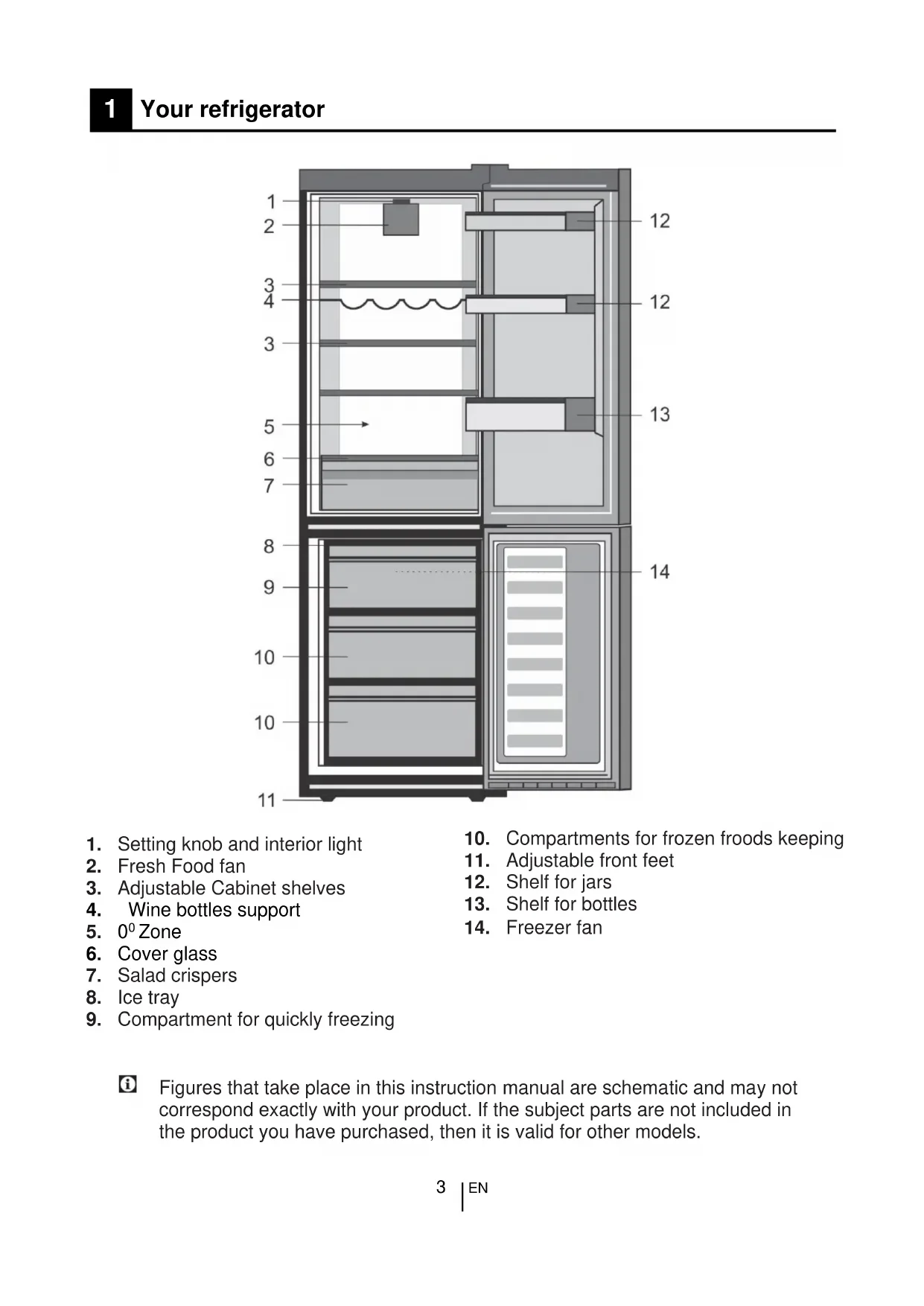 13 ENFreezer Compartment Setting Fridge Compartment Setting Explanations -18°C 4°C This is the normal recommended setting. -20, -22 or -24°C 4°C These settings are recommended when the ambient temperature exceeds 30°C. Quick Freeze 4°C Use when you wish to freeze your food in a short time. If is recommended to be used to maintain the quality of meat and fish products. -18°C or colder 2°C If you think that your fridge compartment is not cold enough because of the hot conditions or frequent opening and closing of the door. -18°C or colder Quick Fridge You can use it when your fridge compartment is overloaded or if you wish to cool down your food rapidly. It is recommended that you activate quick fridge function 4-8 hours before placing the food. Freezer compartment shelves Various frozen food such as meat, fish, ice cream, vegetables and etc. Egg holder Egg Fridge compartment shelves Food in pans, covered plates and closed containers Fridge compartment door shelves Small and packaged food or drinks (such as milk, fruit juice and beer) Crisper Vegetables and fruits Fresh zone compartment Delicatessen products (cheese, butter, salami and etc.)