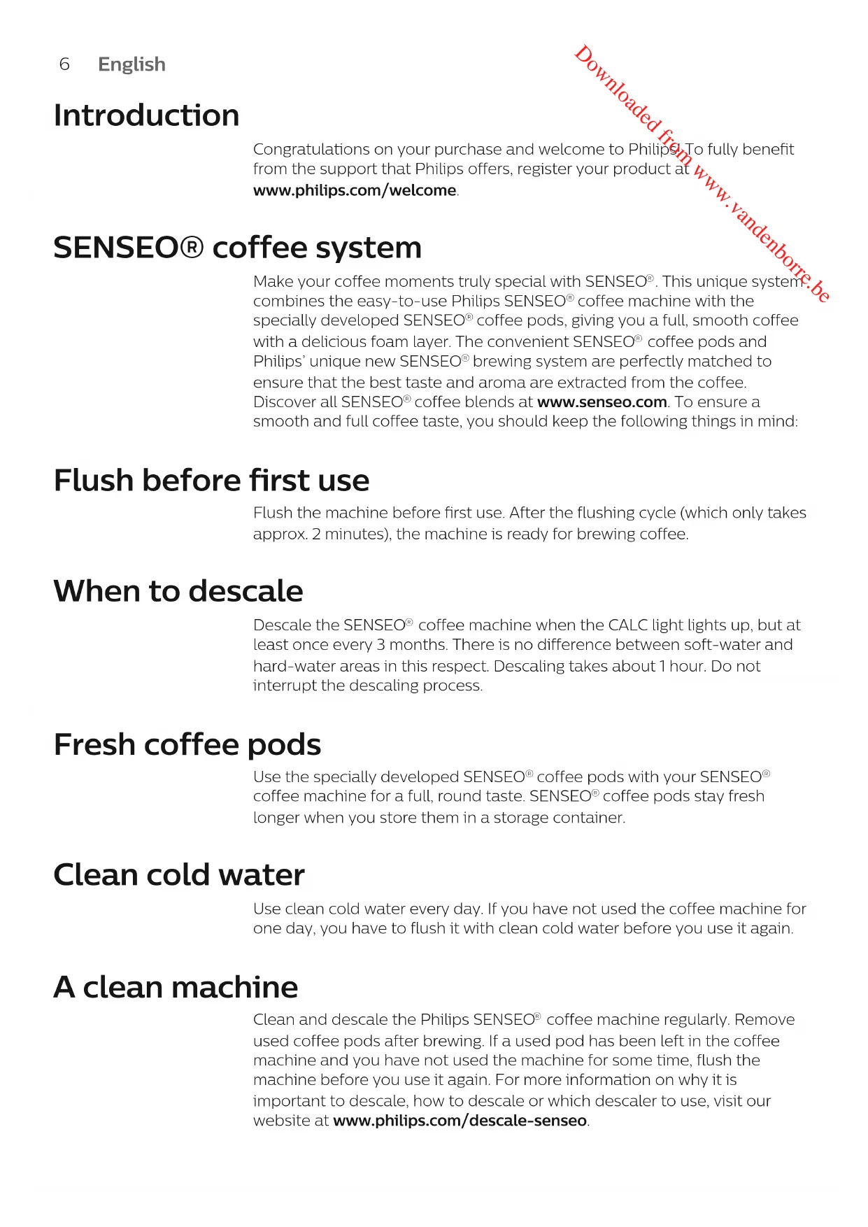 Downloaded from www.vandenborre.beDownloaded from www.vandenborre.beEnglish 6 Deutsch 30 Français 56 Nederlands 81 Downloaded from www.vandenborre.beEnglish Introduction Congratulations on your purchase and welcome to Philips! To fully benefit from the support that Philips offers, register your product at www.philips.com/welcome. SENSEO® coffee system Make your coffee moments truly special with SENSEO