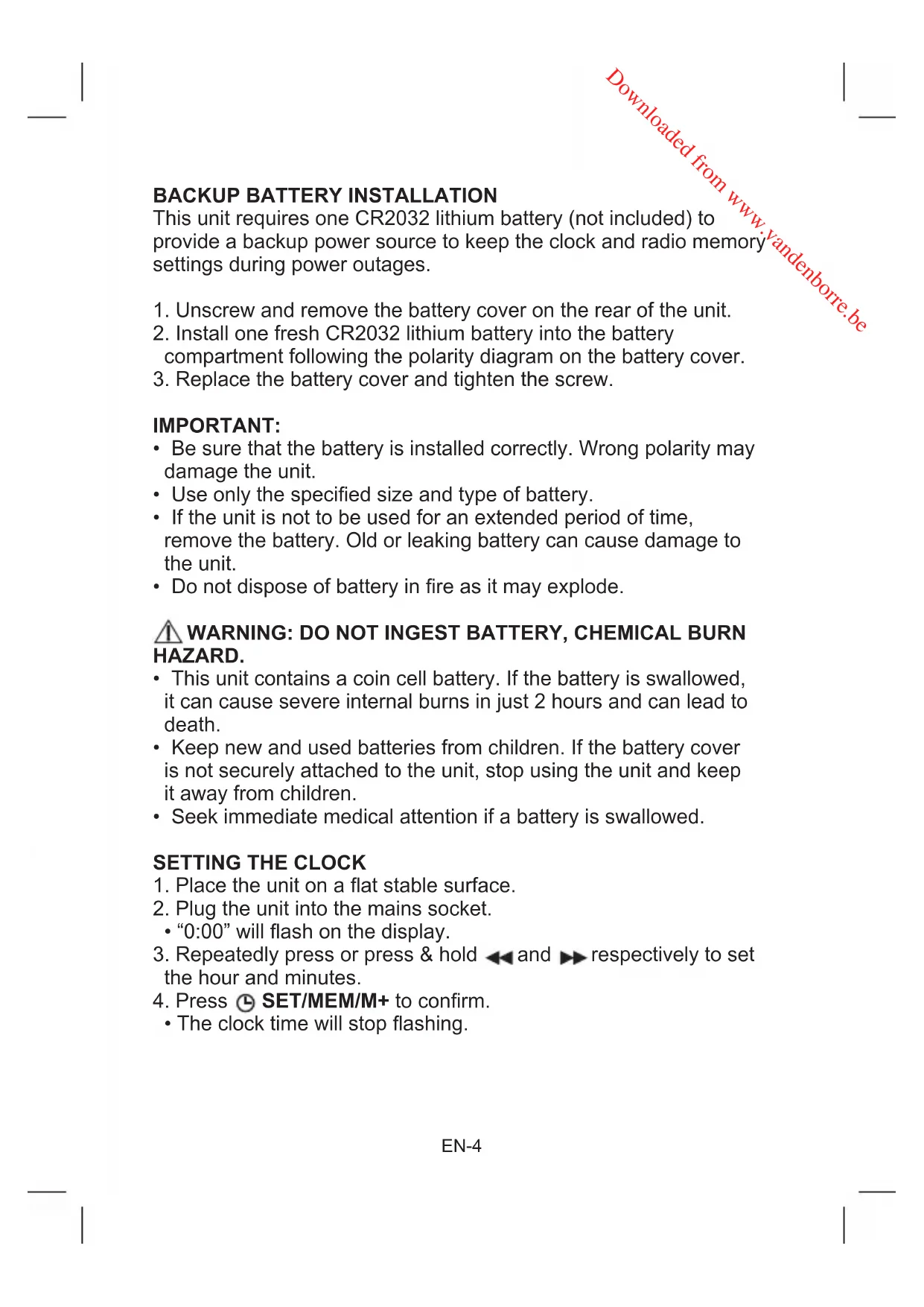 EN-3 Downloaded from www.vandenborre.beBACKUPBATTERYINSTALLATION This unit requires one CR2032 lithium battery (not included) to provide a backup power source to keep the clock and radio memory settings during power outages.