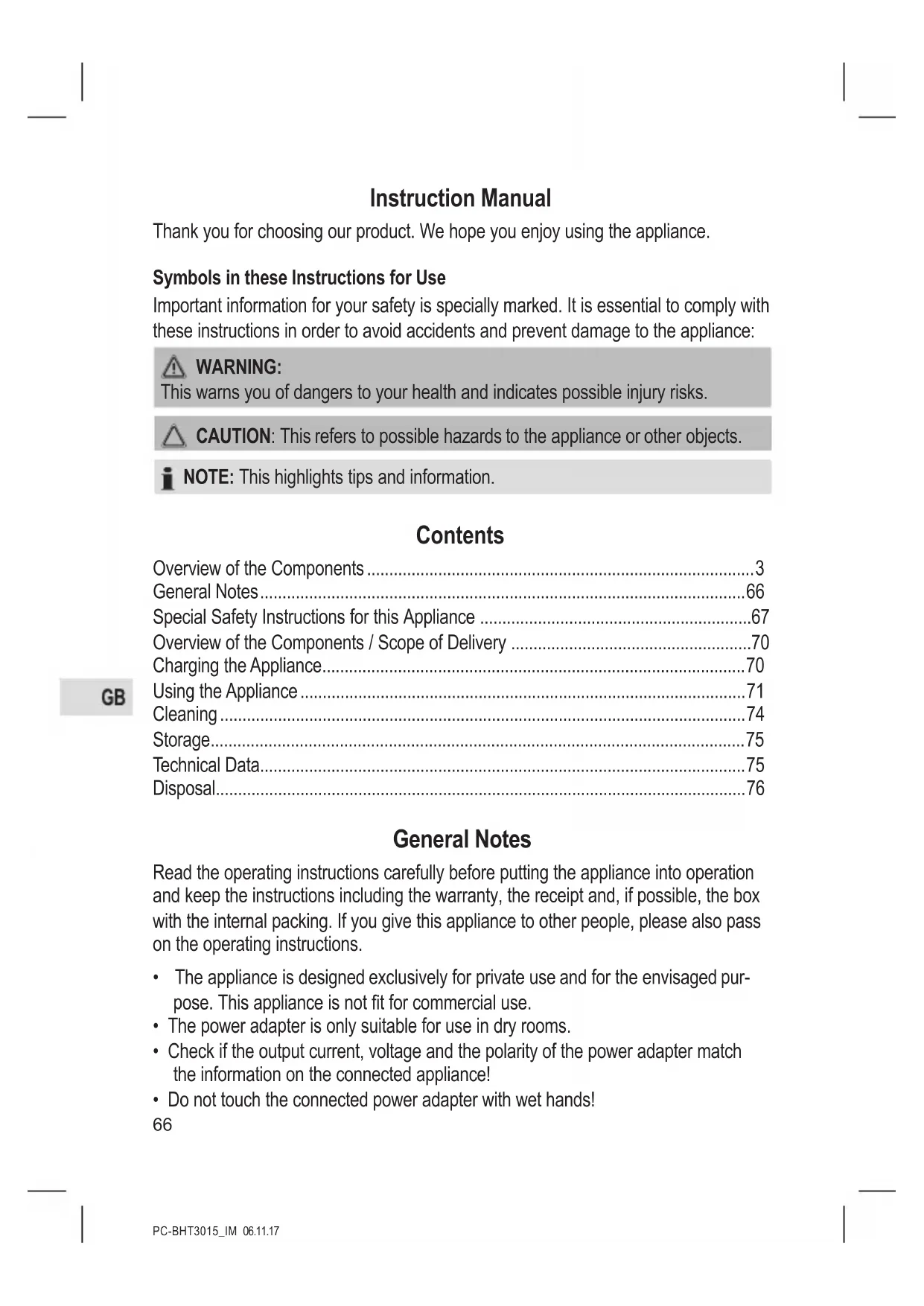 Disposal Remove / Dispose of Rechargeable Batteries The appliance contains a rechargeable battery. Used batteries / accumu- lators (rechargeable batteries) do not belong in domestic waste. The battery must be removed before the product will be recycled. Con- tact qualied personnel. Information, where batteries / accumulators are to be disposed of can be obtained from your local or municipal authorities. Meaning of the “Dustbin” Symbol Protect our environment: do not dispose of electrical equipment in the domestic waste. Please return any electrical equipment that you will no longer use to the collection points provided for their disposal. This helps avoid the potential effects of incorrect disposal on the envi- ronment and human health. This will contribute to the recycling and other forms of reutilisation of electrical and electronic equipment. Information concerning where the equipment can be disposed of can be obtained from your local authority.PC-BHT3015_IM 06.11.17