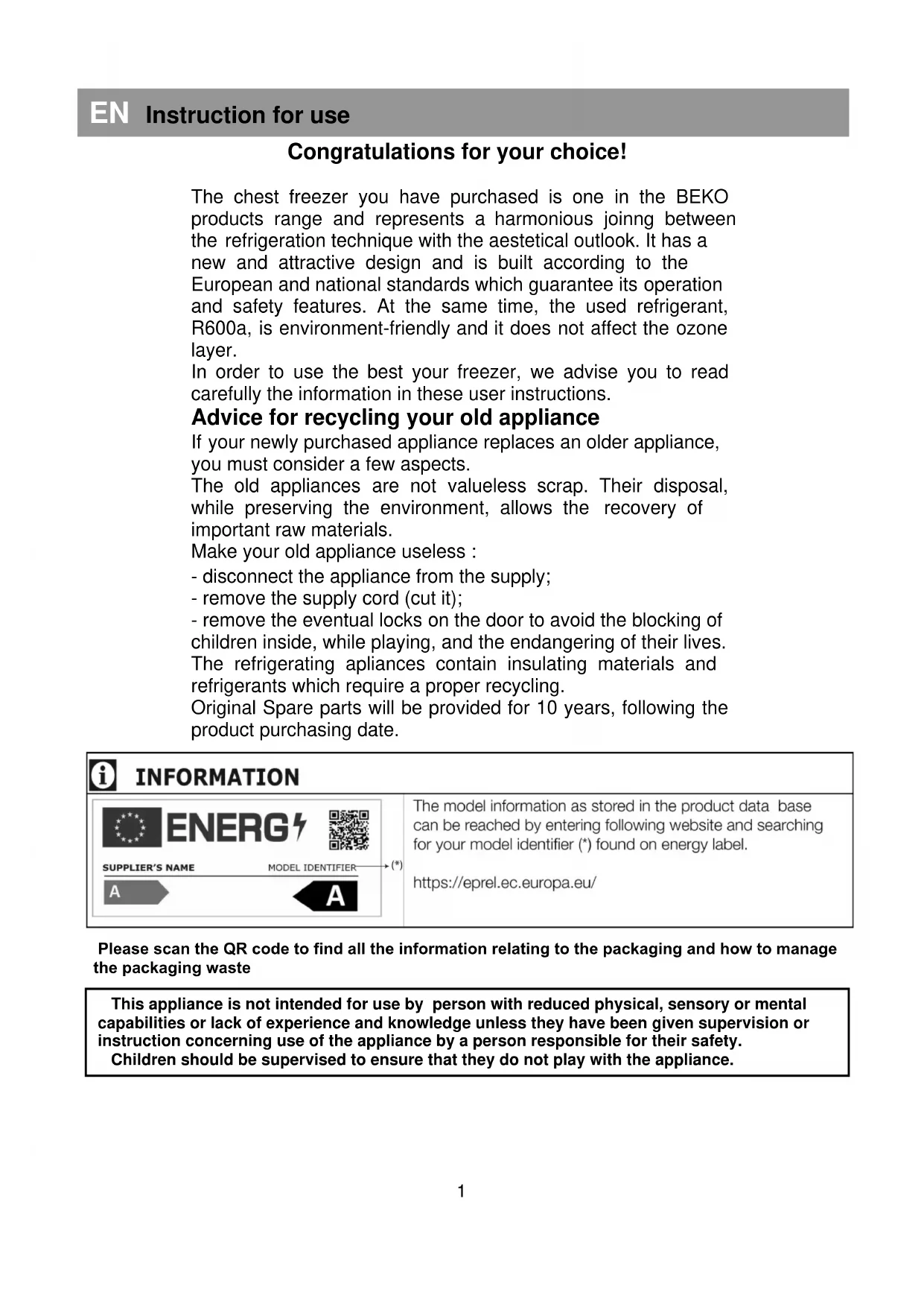 5Congratulations for your choice! The chest freezer you have purchased is one in the BEKO products range and represents a harmonious joinng between the refrigeration technique with the aestetical outlook. It has a new and attractive design and is built according to the European and national standards which guarantee its operation and safety features. At the same time, the used refrigerant, R600a, is environment-friendly and it does not affect the ozone layer. In order to use the best your freezer, we advise you to read carefully the information in these user instructions. Advice for recycling your old appliance If your newly purchased appliance replaces an older appliance, you must consider a few aspects. The old appliances are not valueless scrap. Their disposal, while preserving the environment, allows the recovery of important raw materials. Make your old appliance useless : - disconnect the appliance from the supply; - remove the supply cord (cut it); - remove the eventual locks on the door to avoid the blocking of children inside, while playing, and the endangering of their lives. The refrigerating apliances contain insulating materials and refrigerants which require a proper recycling. Original Spare parts will be provided for 10 years, following the product purchasing date.