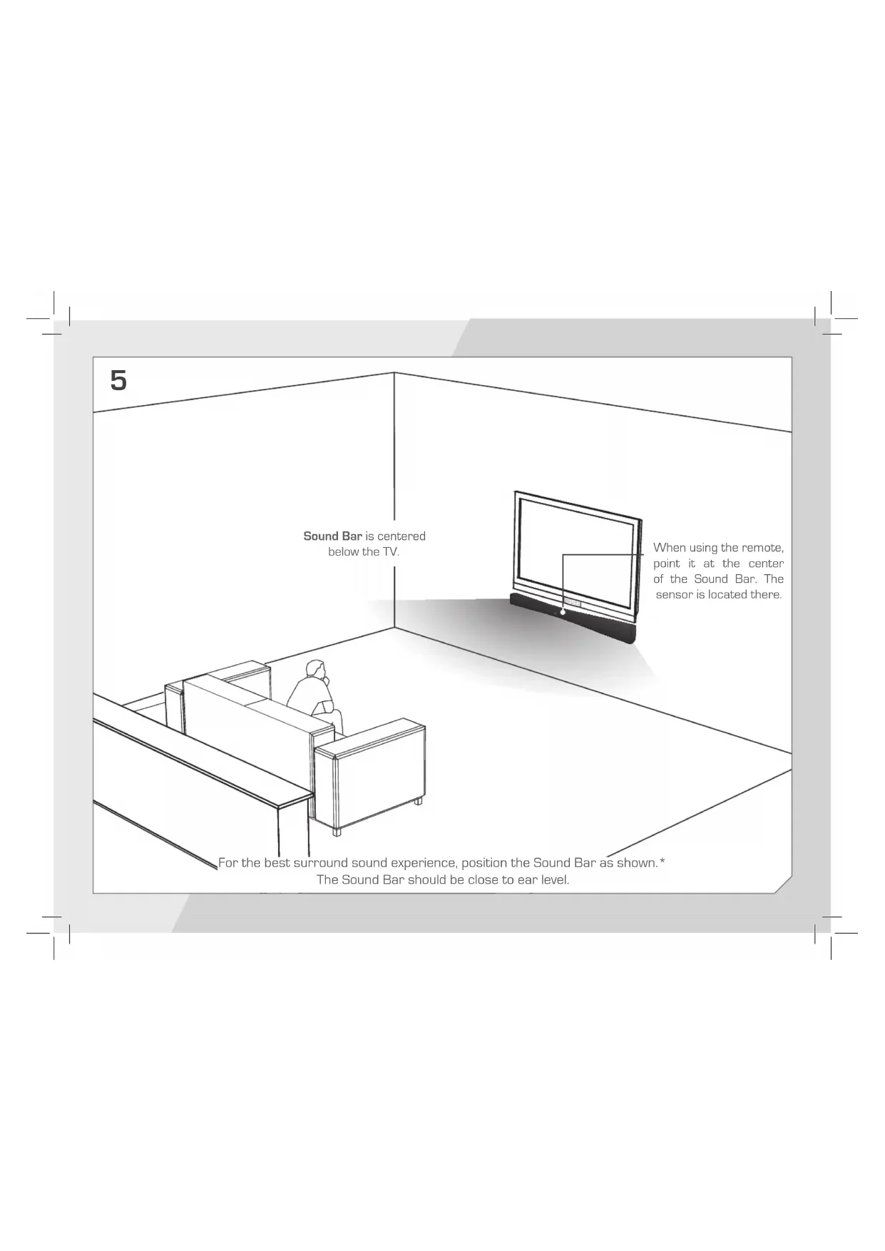 2For the best surround sound experience, position the Sound Bar as shown.* The Sound Bar should be close to ear level. Sound Bar is centered below the TV.