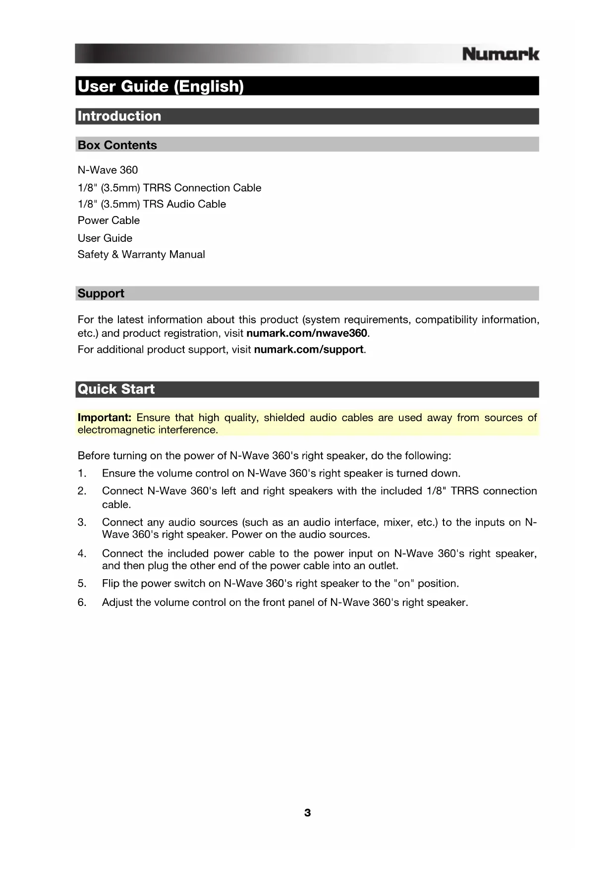 Support For the latest information about this product (system requirements, compatibility information, etc.) and product registration, visit numark.com/nwave360. For additional product support, visit numark.com/support.