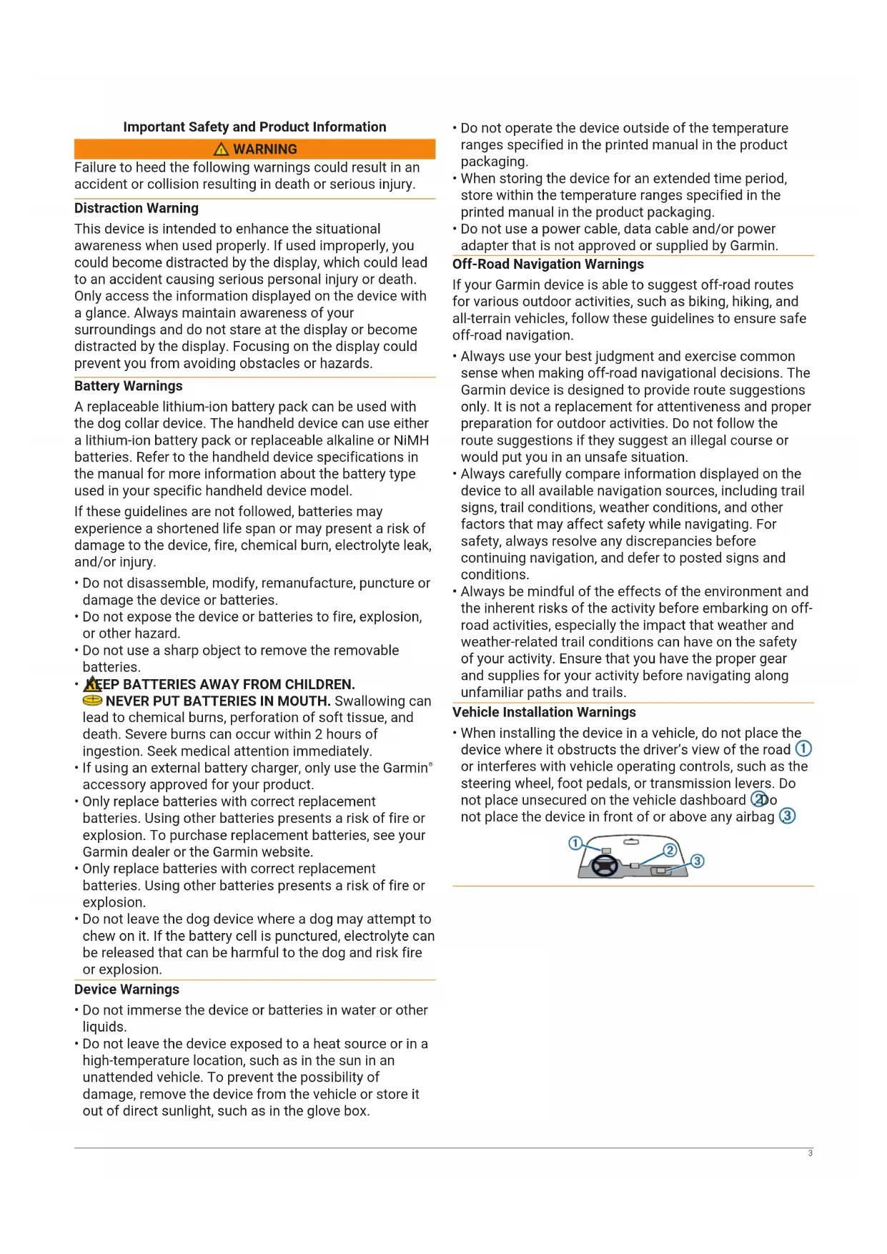 INFORMATION © 2014 Garmin Ltd. or its subsidiaries GUID-4448A574-ABF0-41E5-B9F2-67CCDB87475F v5May 2021Important Safety and Product Information 3 Informations importantes sur le produit et la sécurité 8 guida Informazioni importanti sulla sicurezza e sul prodotto 12 Wichtige Sicherheits- und Produktinformationen 16 Información importante sobre el producto y tu seguridad 20 Informações importantes de segurança e do produto 24 Belangrijke veiligheids- en productinformatie 28 Vigtige produkt- og sikkerhedinformationer 32 Tärkeitä turvallisuus- ja tuotetietoja 36 Viktig sikkerhets- og produktinformasjon 40 Guiden Viktig säkerhets- och produktinformation 44 Ważne informacje dotyczące bezpieczeństwa i produktu 48 Pomembne informacije o varnosti in izdelku 52 Důležité bezpečnostní informace a informace o produktu 56 Fontos biztonsági és terméktudnivalók 60 Правила техники безопасности и сведения об изделии 64 Važne informacije o proizvodu i sigurnosti 69 Σημαντικές πληροφορίες για την ασφάλεια και το προϊόν 73 Informaţii importante privind siguranţa şi produsul 77Important Safety and Product Information WARNING Failure to heed the following warnings could result in an accident or collision resulting in death or serious injury. Distraction Warning This device is intended to enhance the situational awareness when used properly. If used improperly, you could become distracted by the display, which could lead to an accident causing serious personal injury or death. Only access the information displayed on the device with a glance. Always maintain awareness of your surroundings and do not stare at the display or become distracted by the display. Focusing on the display could prevent you from avoiding obstacles or hazards. Battery Warnings A replaceable lithium-ion battery pack can be used with the dog collar device. The handheld device can use either a lithium-ion battery pack or replaceable alkaline or NiMH batteries. Refer to the handheld device specifications in the manual for more information about the battery type used in your specific handheld device model. If these guidelines are not followed, batteries may experience a shortened life span or may present a risk of damage to the device, fire, chemical burn, electrolyte leak, and/or injury.