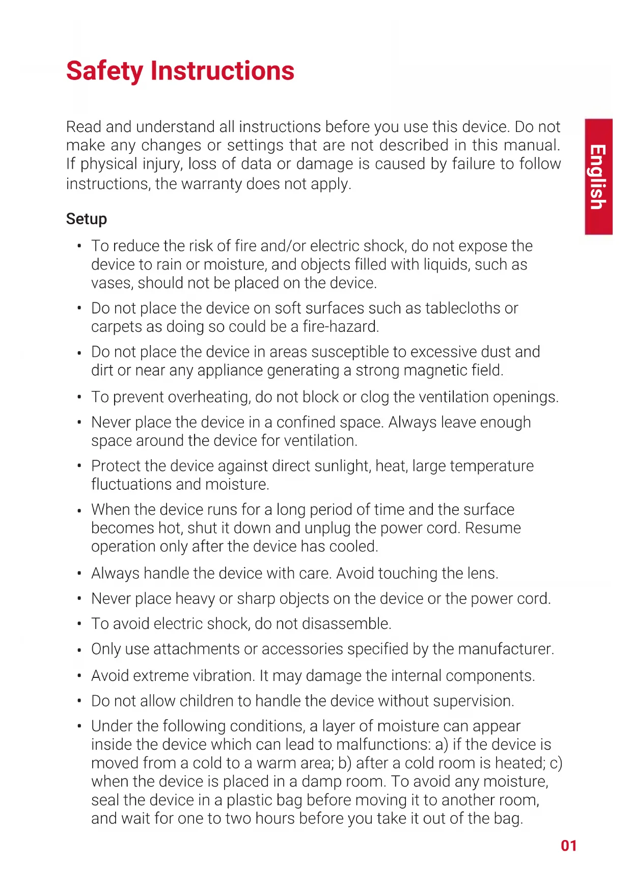 Under the following conditions, a layer of moisture can appear inside the device which can lead to malfunctions: a) if the device is moved from a cold to a warm area; b) after a cold room is heated; c) when the device is placed in a damp room. To avoid any moisture, seal the device in a plastic bag before moving it to another room, and wait for one to two hours before you take it out of the bag.English