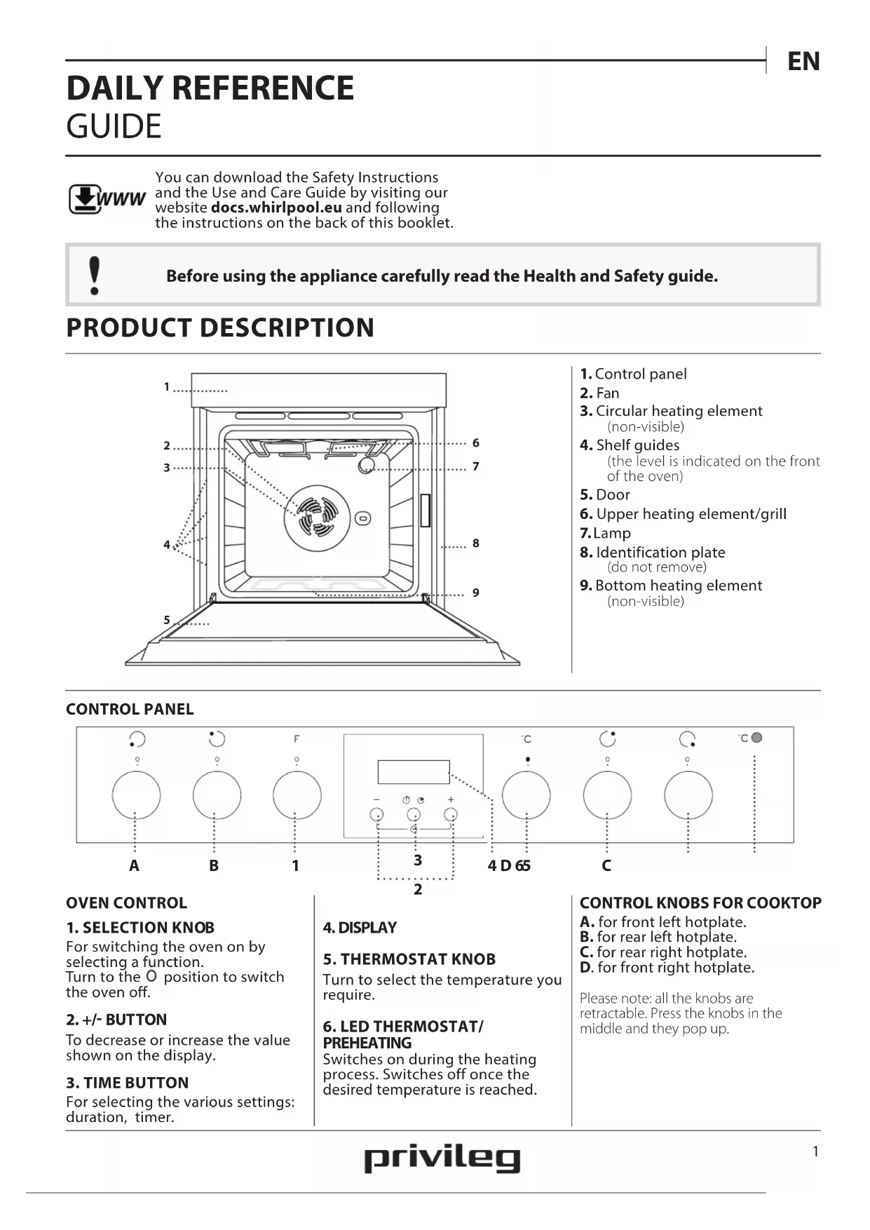 A. for front left hotplate.B. for rear left hotplate.C. for rear right hotplate.D. for front right hotplate.Please note: all the knobs are retractable. Press the knobs in the middle and they pop up. DAILY REFERENCE GUIDE Before using the appliance carefully read the Health and Safety guide. WWW You can download the Safety Instructions and the Use and Care Guide by visiting our website docs.whirlpool.eu and following the instructions on the back of this booklet.