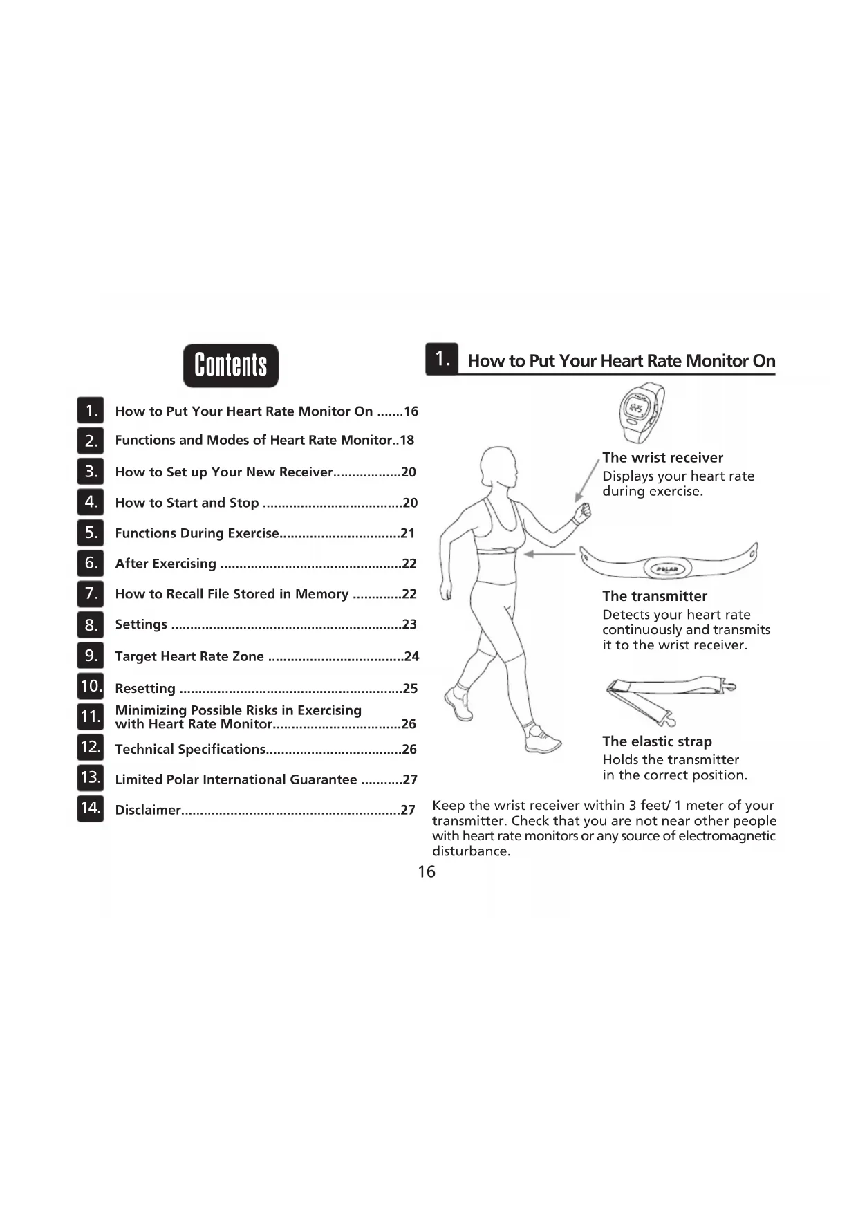 How to Put Your Heart Rate Monitor On The elastic strapHolds the transmitterin the correct position.The transmitterDetects your heart ratecontinuously and transmitsit to the wrist receiver. Contents The wrist receiverDisplays your heart rateduring exercise.After Exercising ................................................22