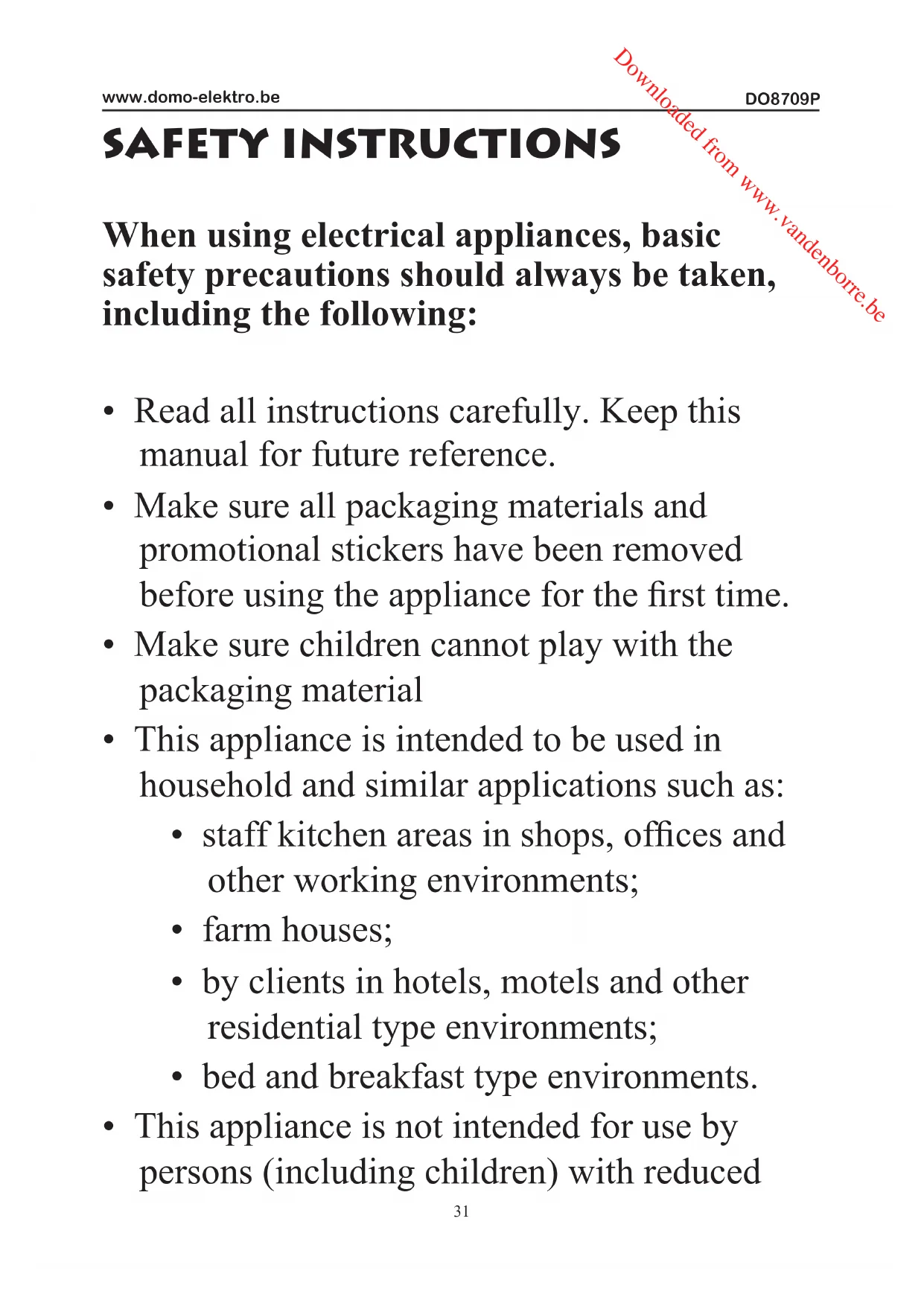 - The appliance must be disconnected from its power source when not in use, during service and when replacing parts. Allow to Downloaded from www.vandenborre.beDO8709P www.domo-elektro.be