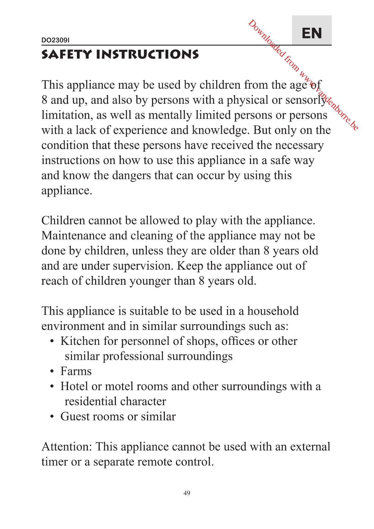 SAFETY INSTRUCTIONS This appliance may be used by children from the age of 8 and up, and also by persons with a physical or sensorly limitation, as well as mentally limited persons or persons with a lack of experience and knowledge. But only on the condition that these persons have received the necessary instructions on how to use this appliance in a safe way and know the dangers that can occur by using this appliance. Children cannot be allowed to play with the appliance. Maintenance and cleaning of the appliance may not be done by children, unless they are older than 8 years old and are under supervision. Keep the appliance out of reach of children younger than 8 years old. This appliance is suitable to be used in a household environment and in similar surroundings such as:
