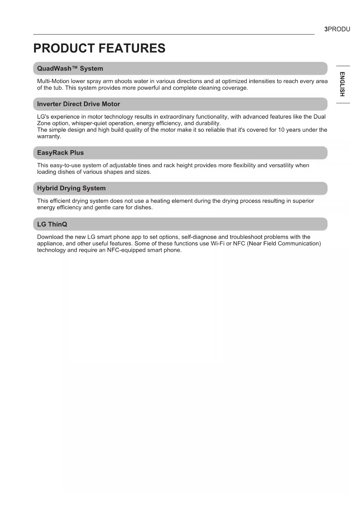 9 PRODUCT OVERVIEW 9 Exterior Parts 10 Interior Parts 10 Accessories 11 INSTALLATION 11 Installation Parts and Tools 12 Installation Overview 12 Product Dimensions 12 Product Specifications 13 Preparing Cabinet Opening 14 Preparing Water and Electrical Connections 15 Preparing Dishwasher 16 Attaching Installation Brackets 17 Sliding Dishwasher into Cabinet Opening 19 Connecting Water Supply Line and Power 21 Connecting Drain Hose 23 Leveling Dishwasher 25 Securing Dishwasher to Cabinet Opening 26 Final Installation Check 27 OPERATION 27 Using the Appliance 28 Control Panel 29 Cycles 30 Options 31 Cycle/Option Guide 32 Loading the Dishwasher 32 Loading the Lower Rack 34 Loading the Silverware Basket 35 Loading the Upper Rack 37 Loading the Cutlery Rack 38 Adding Cleaning Agents 40 SMART FUNCTIONS 40 LG ThinQ Application 41 Smart Diagnosis™ Function 42 MAINTENANCE 42 Cleaning the Exterior 42 Cleaning the Interior 42 Seasonal Maintenance and Storage 43 Clogged Drain Air Gap or In-Sink Disposal 44 Cleaning the Filters 45 Cleaning the Spray Arms 46 TROUBLESHOOTING 46 FAQs: Frequently Asked Questions 48 User Support Videos 49 Before Calling for Service 53 LIMITED WARRANTY 53 FOR USA 57 LIMITED WARRANTY 57 FOR CANADA 61 Warranty Exceptions (U.S and Canada)3PRODUCT FEATURES ENGLISH PRODUCT FEATURES QuadWash™ System Multi-Motion lower spray arm shoots water in various directions and at optimized intensities to reach every area of the tub. This system provides more powerful and complete cleaning coverage. Inverter Direct Drive Motor LG's experience in motor technology results in extraordinary functionality, with advanced features like the Dual Zone option, whisper-quiet operation, energy efficiency, and durability. The simple design and high build quality of the motor make it so reliable that it's covered for 10 years under the warranty. EasyRack Plus This easy-to-use system of adjustable tines and rack height provides more flexibility and versatility when loading dishes of various shapes and sizes. Hybrid Drying System This efficient drying system does not use a heating element during the drying process resulting in superior energy efficiency and gentle care for dishes. LG ThinQ Download the new LG smart phone app to set options, self-diagnose and troubleshoot problems with the appliance, and other useful features. Some of these functions use Wi-Fi or NFC (Near Field Communication) technology and require an NFC-equipped smart phone.4 SAFETY INSTRUCTIONS SAFETY INSTRUCTIONS