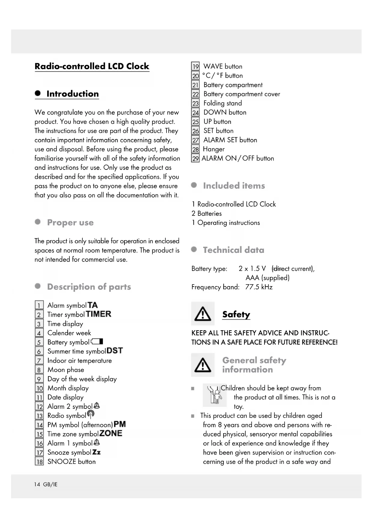 ALARM ON / OFF button Included items 1 Radio-controlled LCD Clock 2 Batteries 1 Operating instructions Technical data Battery type: 2 x 1.5 V (direct current), AAA (supplied) Frequency band: 77.5 kHz Safety KEEP ALL THE SAFETY ADVICE AND INSTRUC- TIONS IN A SAFE PLACE FOR FUTURE REFERENCE! General safety information Children should be kept away from the product at all times. This is not a toy. This product can be used by children aged from 8years and above and persons with re- duced physical, sensoryor mental capabilities or lack of experience and knowledge if they have been given supervision or instruction con- cerning use of the product in a safe way and15 GB/IE understand the hazards involved. Children shall not play with the product. Cleaning and user maintenance shall not be made by children without supervision. Do not use the product in hospitals or medical facilities, as otherwise this may result in malfunctions of life-support systems. Under no circumstances should you take the product apart. Improper repairs may place the user in considerable danger. Repairs should only be carried out by specialist personnel. Safety instructions for batteries / rechargeable batteries DANGER TO LIFE! Keep batteries / re- chargeable batteries out of reach of children. If accidentally swallowed seek immediate medical attention. DANGER OF EXPLOSION! Never recharge non-rechargeable batteries. Do not short-circuit batter- ies / rechargeable batteries and / or open them. Overheating, fire or bursting can be the result. Never throw batteries / rechargeable batteries into fire or water. Do not exert mechanical loads to batteries / rechargeable batteries. Risk of leakage of batteries / rechargeable batteries Avoid extreme environmental conditions and temperatures, which could affect batteries / rechargeable batteries, e.g. radiators / direct sunlight. If batteries / rechargeable batteries have leaked, avoid contact with skin, eyes and mucous membranes with the chemicals! Flush immediately the affected areas with fresh water and seek medical attention! WEAR PROTECTIVE GLOVES! Leaked or damaged batteries / rechargeable batteries can cause burns on contact with the skin. Wear suitable protective gloves at all times if such an event occurs. In the event of a leakage of batteries / rechargeable batteries, immediately remove them from the product to prevent damage. Only use the same type of batteries / recharge- able batteries. Do not mix used and new batteries / rechargeable batteries. Remove batteries / rechargeable batteries if the product will not be used for a longer period. Risk of damage of the product Only use the specified type of battery / rechargeable battery! Insert batteries / rechargeable batteries accord- ing to polarity marks (+) and (-) on the bat- tery / rechargeable battery and the product. Clean the contacts on the battery / rechargea- ble battery and in the battery compartment before inserting! Remove exhausted batteries / rechargeable batteries from the product immediately. Before initial use Note: Remove all packaging materials from the product. Remove the protective foil before first use. Remove the plastic strip sticking out of the battery compartment