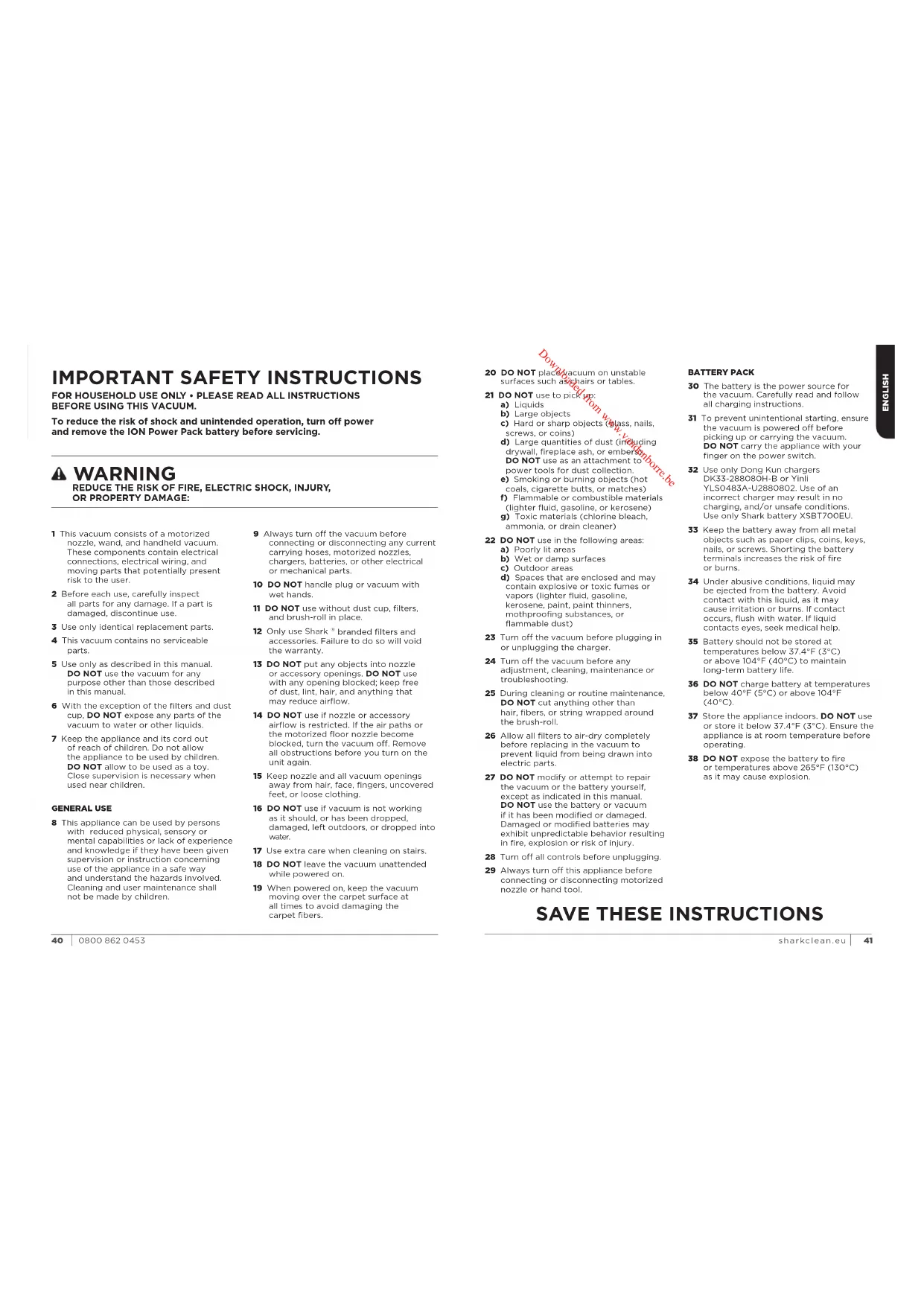 9 Always turn o the vacuum before connecting or disconnecting any current carrying hoses, motorized nozzles, chargers, batteries, or other electrical or mechanical parts. 10 DO NOT handle plug or vacuum with wet hands. 11 DO NOT use without dust cup, filters, and brush-roll in place. 12 Only use Shark