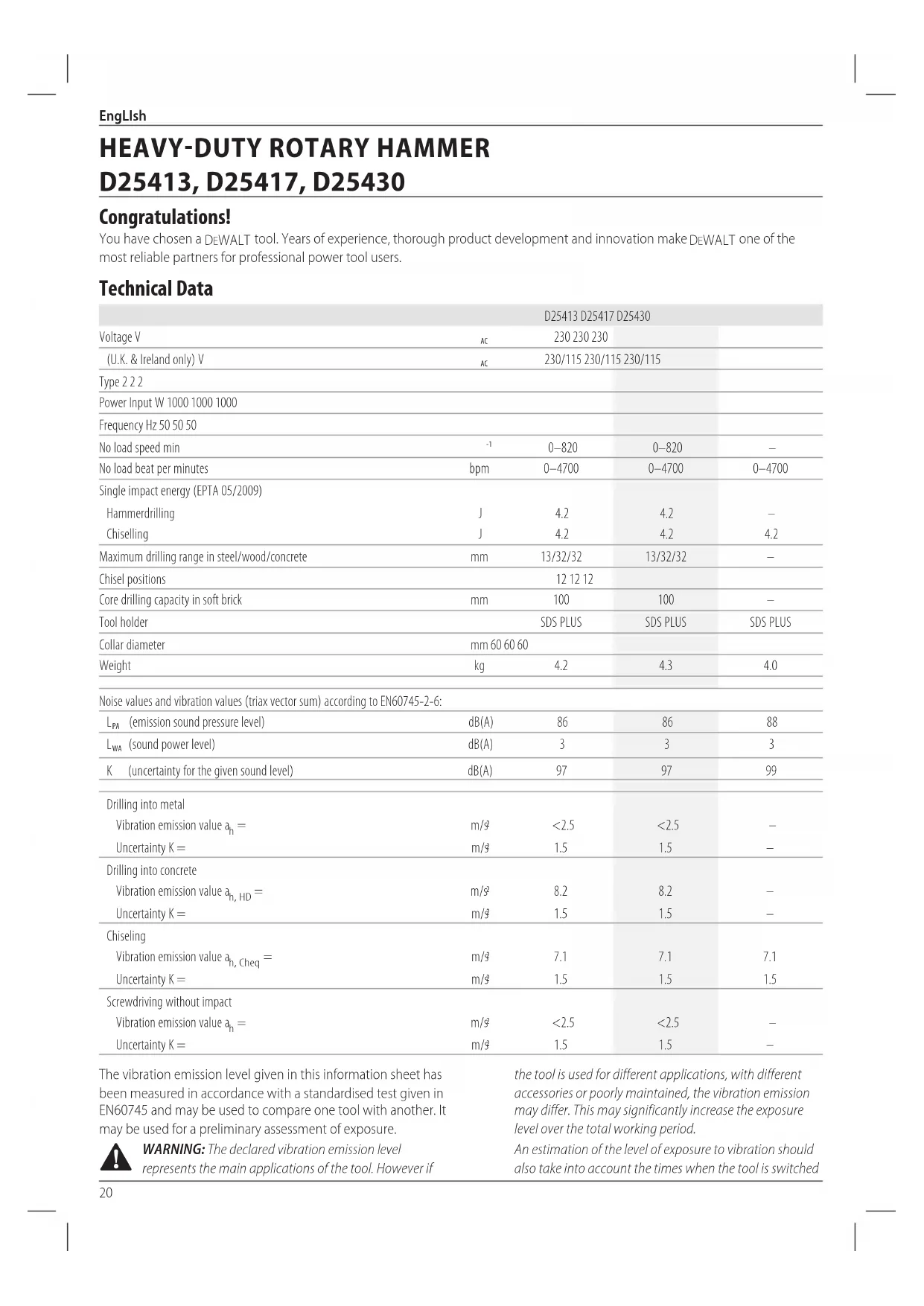 D25413, D25417, D25430 Congratulations! You have chosen a DeWALT tool. Years of experience, thorough product development and innovation make DeWALT one of the most reliable partners for professional power toolusers. Technical Data D25413 D25417 D25430 Voltage V