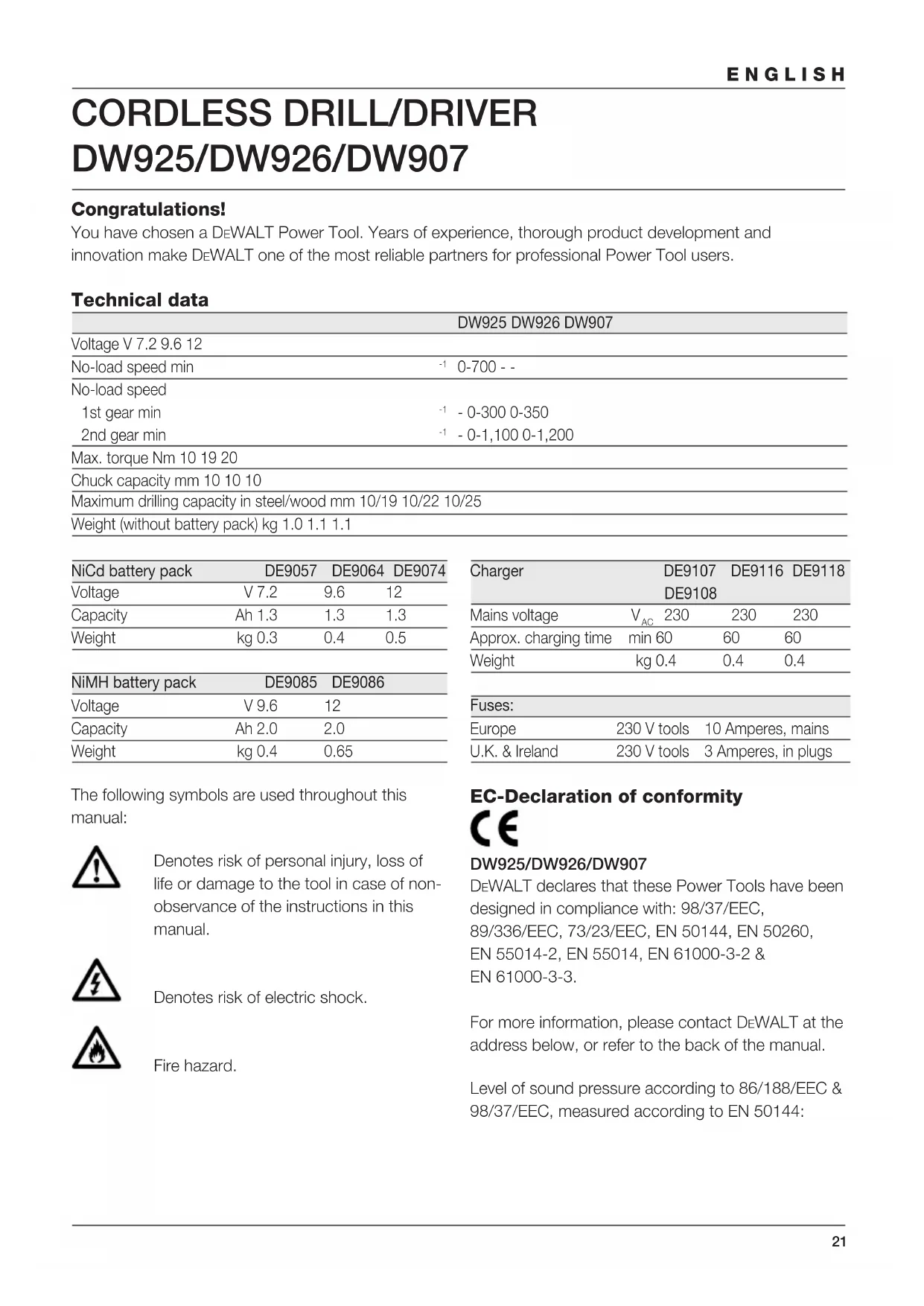 Approx. charging time min 60 60 60 Weight kg 0.4 0.4 0.4 Fuses: Europe 230 V tools 10 Amperes, mains U.K. & Ireland 230 V tools 3 Amperes, in plugs The following symbols are used throughout this manual: Denotes risk of personal injury, loss of life or damage to the tool in case of non- observance of the instructions in this manual. Denotes risk of electric shock. Fire hazard.22 ENGLISH DW925 DW926 DW907