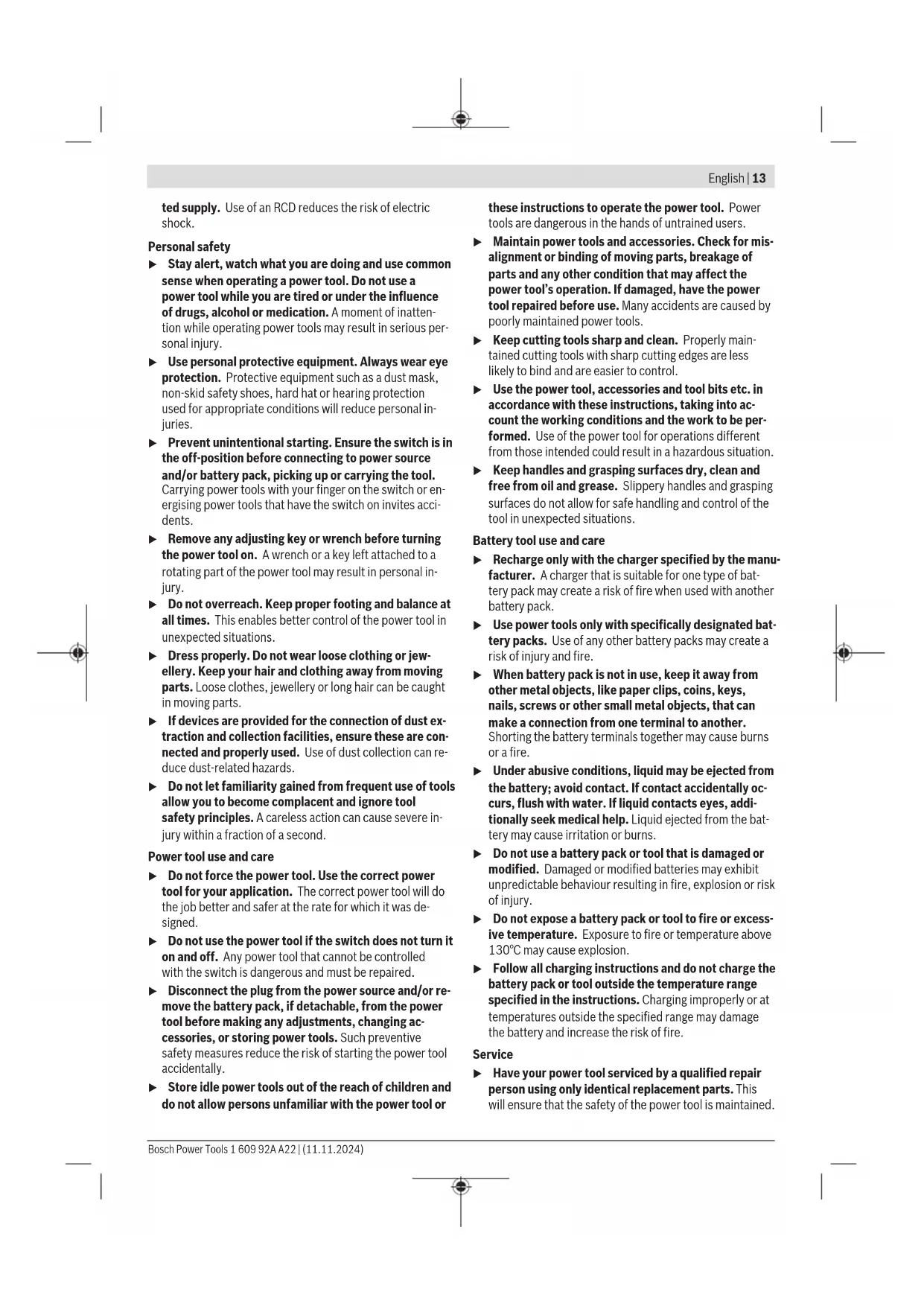 äußeren Abmessung größer als 25cm sind, im Einzel- handelsgeschäft oder in unmittelbarer Nähe hierzu un- entgeltlich zurückzunehmen; die Rücknahme darf nicht an den Kauf eines Elektro- oder Elektronikgerätes ge- knüpft werden und ist auf drei Altgeräte pro Geräteart beschränkt. Der Vertreiber hat beim Abschluss des Kaufvertrags für das neue Elektro- oder Elektronikgerät den Endnutzer über die Möglichkeit zur unentgeltlichen Rückgabe bzw. Abholung des Altgeräts zu informieren und den Endnutzer nach seiner Absicht zu befragen, ob bei der Auslieferung des neuen Ge- räts ein Altgerät zurückgegeben wird. Dies gilt auch bei Vertrieb unter Verwendung von Fernkom- munikationsmitteln, wenn die Lager- und Versandflächen für Elektro- und Elektronikgeräte mindestens 400m² betragen oder die gesamten Lager- und Versandflächen mindestens 800m² betragen, wobei die unentgeltliche Abholung auf Elektro- und Elektronikgeräte der Kategorien 1 (Wärmeüber- träger), 2 (Bildschirmgeräte) und 4 (Großgeräte mit mindes- tens einer äußeren Abmessung über 50cm) beschränkt ist. Für alle übrigen Elektro- und Elektronikgeräte muss der Ver- treiber geeignete Rückgabemöglichkeiten in zumutbarer Ent- fernung zum jeweiligen Endnutzer gewährleisten; das gilt auch für Altgeräte, die in keiner äußeren Abmessung größer als 25cm sind, die der Endnutzer zurückgeben will, ohne ein neues Gerät zu kaufen. Akkus/Batterien: Li-Ion: Bitte beachten Sie die Hinweise im Abschnitt Transport (sie- he „Transport“, Seite11). English Safety Instructions General Power Tool Safety Warnings WARNING Read all safety warnings, instruc- tions, illustrations and specifica- tions provided with this power tool. Failure to follow all in- structions listed below may result in electric shock, fire and/ or serious injury. Save all warnings and instructions for future reference. The term "power tool" in the warnings refers to your mains- operated (corded) power tool or battery-operated (cord- less) power tool. Work area safety u Keep work area clean and well lit. Cluttered or dark areas invite accidents. u Do not operate power tools in explosive atmospheres, such as in the presence of flammable liquids, gases or dust. Power tools create sparks which may ignite the dust or fumes. u Keep children and bystanders away while operating a power tool. Distractions can cause you to lose control. Electrical safety u Power tool plugs must match the outlet. Never modify the plug in any way. Do not use any adapter plugs with earthed (grounded) power tools. Unmodified plugs and matching outlets will reduce risk of electric shock. u Avoid body contact with earthed or grounded sur- faces, such as pipes, radiators, ranges and refrigerat- ors. There is an increased risk of electric shock if your body is earthed or grounded. u Do not expose power tools to rain or wet conditions. Water entering a power tool will increase the risk of elec- tric shock. u Do not abuse the cord. Never use the cord for carry- ing, pulling or unplugging the power tool. Keep cord away from heat, oil, sharp edges or moving parts. Damaged or entangled cords increase the risk of electric shock. u When operating a power tool outdoors, use an exten- sion cord suitable for outdoor use. Use of a cord suit- able for outdoor use reduces the risk of electric shock. u If operating a power tool in a damp location is un- avoidable, use a residual current device (RCD) protec- 1 609 92A A22 | (11.11.2024) Bosch Power ToolsEnglish | 13 ted supply. Use of an RCD reduces the risk of electric shock. Personal safety u Stay alert, watch what you are doing and use common sense when operating a power tool. Do not use a power tool while you are tired or under the influence of drugs, alcohol or medication. A moment of inatten- tion while operating power tools may result in serious per- sonal injury. u Use personal protective equipment. Always wear eye protection. Protective equipment such as a dust mask, non-skid safety shoes, hard hat or hearing protection used for appropriate conditions will reduce personal in- juries. u Prevent unintentional starting. Ensure the switch is in the off-position before connecting to power source and/or battery pack, picking up or carrying the tool. Carrying power tools with your finger on the switch or en- ergising power tools that have the switch on invites acci- dents. u Remove any adjusting key or wrench before turning the power tool on. A wrench or a key left attached to a rotating part of the power tool may result in personal in- jury. u Do not overreach. Keep proper footing and balance at all times. This enables better control of the power tool in unexpected situations. u Dress properly. Do not wear loose clothing or jew- ellery. Keep your hair and clothing away from moving parts. Loose clothes, jewellery or long hair can be caught in moving parts. u If devices are provided for the connection of dust ex- traction and collection facilities, ensure these are con- nected and properly used. Use of dust collection can re- duce dust-related hazards. u Do not let familiarity gained from frequent use of tools allow you to become complacent and ignore tool safety principles. A careless action can cause severe in- jury within a fraction of a second. Power tool use and care u Do not force the power tool. Use the correct power tool for your application. The correct power tool will do the job better and safer at the rate for which it was de- signed. u Do not use the power tool if the switch does not turn it on and off. Any power tool that cannot be controlled with the switch is dangerous and must be repaired. u Disconnect the plug from the power source and/or re- move the battery pack, if detachable, from the power tool before making any adjustments, changing ac- cessories, or storing power tools. Such preventive safety measures reduce the risk of starting the power tool accidentally. u Store idle power tools out of the reach of children and do