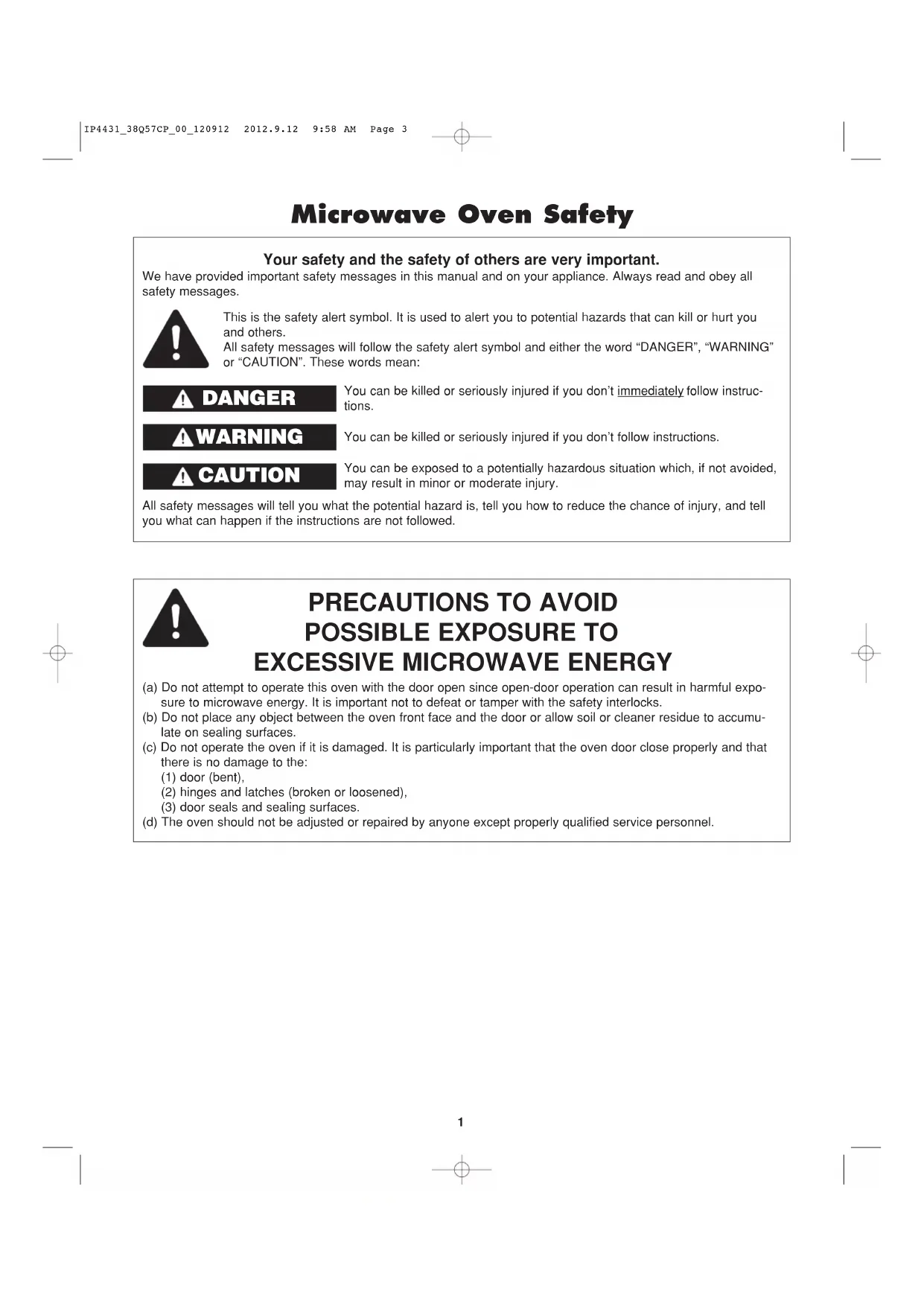(a) Do not attempt to operate this oven with the door open since open-door operation can result in harmful expo- sure to microwave energy. It is important not to defeat or tamper with the safety interlocks. (b) Do not place any object between the oven front face and the door or allow soil or cleaner residue to accumu- late on sealing surfaces. (c) Do not operate the oven if it is damaged. It is particularly important that the oven door close properly and that there is no damage to the: (1) door (bent), (2) hinges and latches (broken or loosened), (3) door seals and sealing surfaces. (d) The oven should not be adjusted or repaired by anyone except properly qualified service personnel. All safety messages will tell you what the potential hazard is, tell you how to reduce the chance of injury, and tell you what can happen if the instructions are not followed. This is the safety alert symbol. It is used to alert you to potential hazards that can kill or hurt you and others. All safety messages will follow the safety alert symbol and either the word “DANGER”, “WARNING” or “CAUTION”. These words mean: You can be killed or seriously injured if you don’t immediately follow instruc- tions. You can be killed or seriously injured if you don’t follow instructions. Microwave Oven Safety DDAANNGGEERR WWAARRNNIINNGG You can be exposed to a potentially hazardous situation which, if not avoided, may result in minor or moderate injury. CCAAUUTTIIOONN IP4431_38Q57CP_00_120912 2012.9.12 9:58 AM Page 32