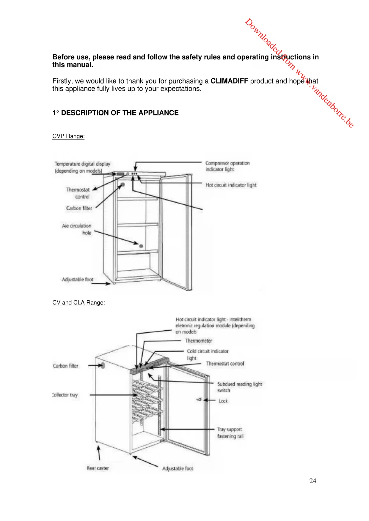 The anti-vibration system Wine does not like to be disturbed. It especially dislikes vibration. This is why your wine cellar’s slow-cycle compressor is mounted on special shock absorbers called "silent blocks". Likewise, the inner container is insulated from the body by a thick layer of polyurethane foam which also has the particular feature of absorbing vibration. Depending on the model, the wine bottle shelves are made of solid wood and absorb vibration better than metal. On some models, the shelf supports are also equipped with rubber pads. Your bottles are enjoying perfect peace! Hygrometry Your Climadiff cellar is equipped with a dynamic humidity system, which regulates the humidity level in the cabinet entirely automatically. No addition of water is required. It is necessary to wait a few days after start-up for the average (between 55 and 70%) to stabilise in the cabinet. Frost will form at the bottom of the cabinet: no cause for worry, this is a normal phenomenon, which may appear when the appliance is used for the first time during the hotter periods of the year and which will disappear when the natural inertia level is reached. The winter system (optional on some models) The winter kit is a frost protection system which enables the cellar to operate in an environment where the temperature is between 0 and 32°C. A sensor located outside the appliance triggers a low power electrical element when the ambient temperature in the room falls to around 8°C in case. This is a low power element to avoid sudden rises in the temperature of the wine and so avoid thermal shocks that are damaging to the preservation of the wine. The kit is intended to raise the cellar’s internal temperature even before there is a thermal exchange with the bottles. IMPORTANT: If the temperature in the room where your wine cellar is located is about 12ºC (±2), no production of warm or cold air will be observed. The appliance is then completely silent and this is quite normal. It should not be considered as a malfunction. The anti-UV system Light accelerates the aging of wine. In our solid door cellars, your wines are naturally protected, on condition, of course, that the door is not opened too often. Models with a glass door are UV treated, thus filtering out damaging ultraviolet rays: your wines are therefore protected. Defrosting Your appliance is equipped with an automatic defrost cycle. When a cooling cycle finishes, the appliance’s refrigerated surfaces are defrosted automatically. The defrost water is channelled into a condensates evaporation tray which is located in the back of the appliance near the compressor. The heat produced by the compressor then evaporates the condensates collected in the tray. Downloaded from www.vandenborre.be35