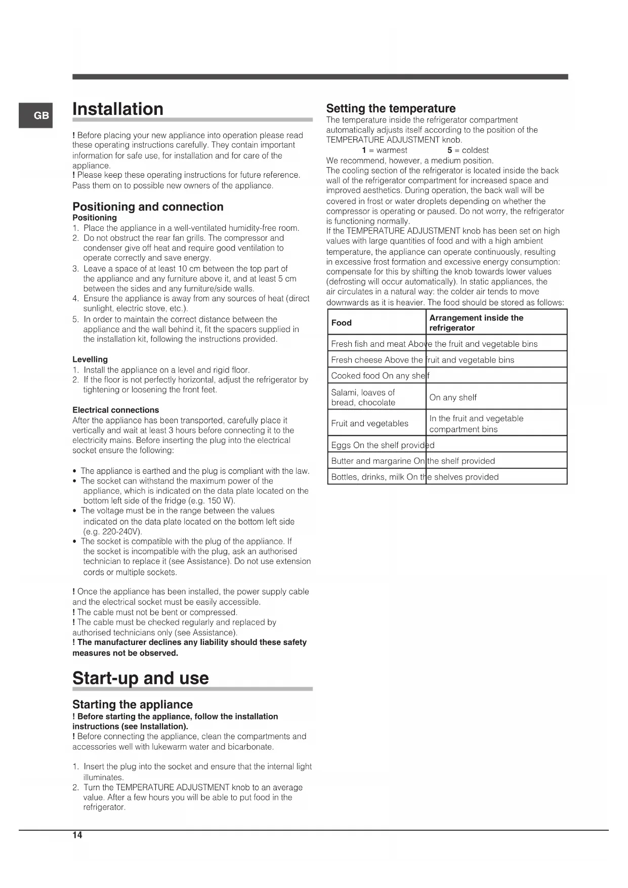 value. After a few hours you will be able to put food in the refrigerator. Setting the temperature The temperature inside the refrigerator compartment automatically adjusts itself according to the position of the TEMPERATURE ADJUSTMENT knob. 1 = warmest 5 = coldest We recommend, however, a medium position. The cooling section of the refrigerator is located inside the back wall of the refrigerator compartment for increased space and improved aesthetics. During operation, the back wall will be covered in frost or water droplets depending on whether the compressor is operating or paused. Do not worry, the refrigerator is functioning normally. If the TEMPERATURE ADJUSTMENT knob has been set on high values with large quantities of food and with a high ambient temperature, the appliance can operate continuously, resulting in excessive frost formation and excessive energy consumption: compensate for this by shifting the knob towards lower values (defrosting will occur automatically). In static appliances, the air circulates in a natural way: the colder air tends to move downwards as it is heavier. The food should be stored as follows: Food Arrangement inside the refrigerator Fresh fish and meat Above the fruit and vegetable bins Fresh cheese Above the fruit and vegetable bins Cooked food On any shelf Salami, loaves of bread, chocolate On any shelf Fruit and vegetables In the fruit and vegetable compartment bins Eggs On the shelf provided Butter and margarine On the shelf provided Bottles, drinks, milk On the shelves providedGB