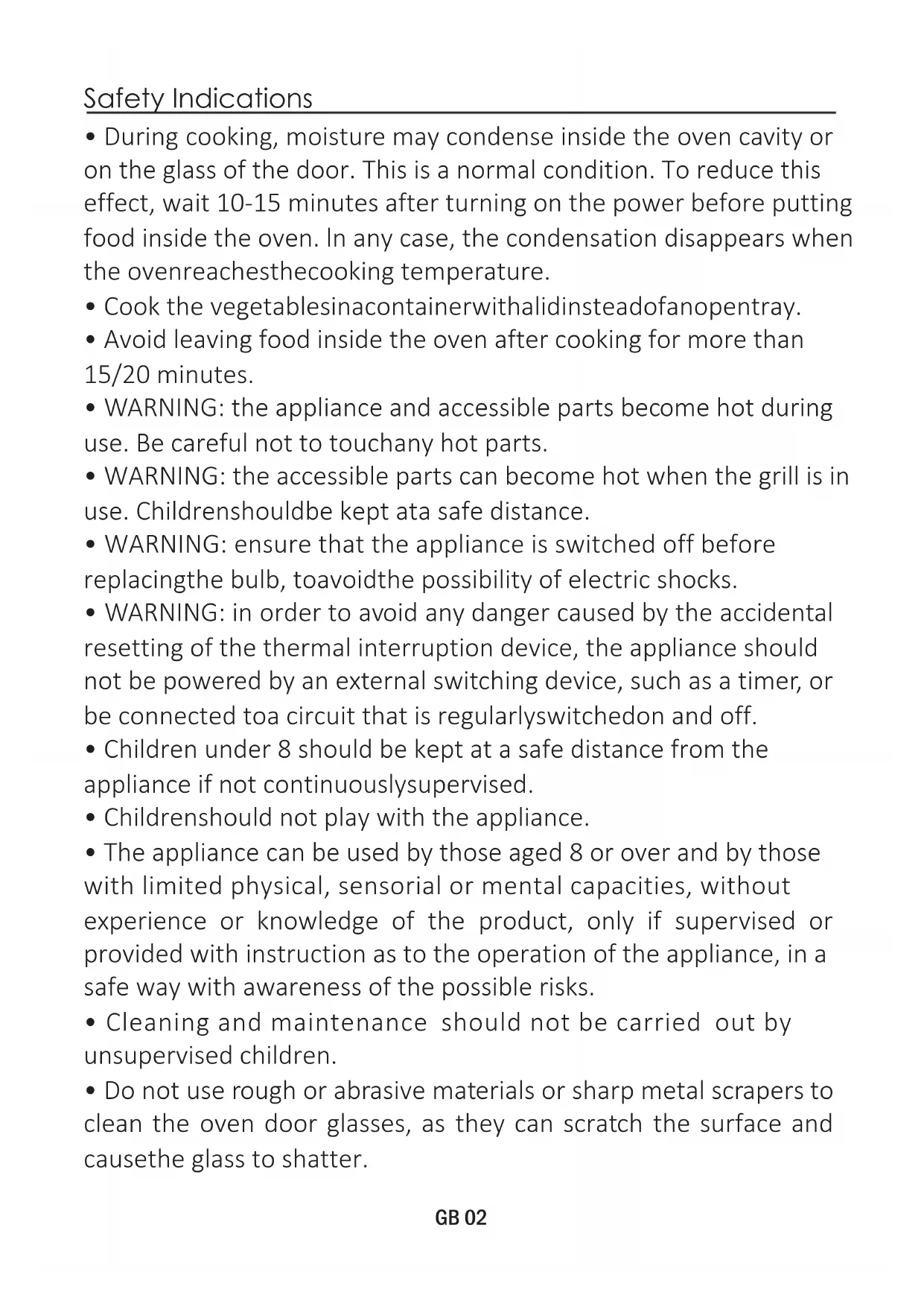 - Do not use rough or abrasive materials or sharp metal scrapers to clean the oven door glasses, as they can scratch the surface and causethe glass to shatter. GB 02GB 03