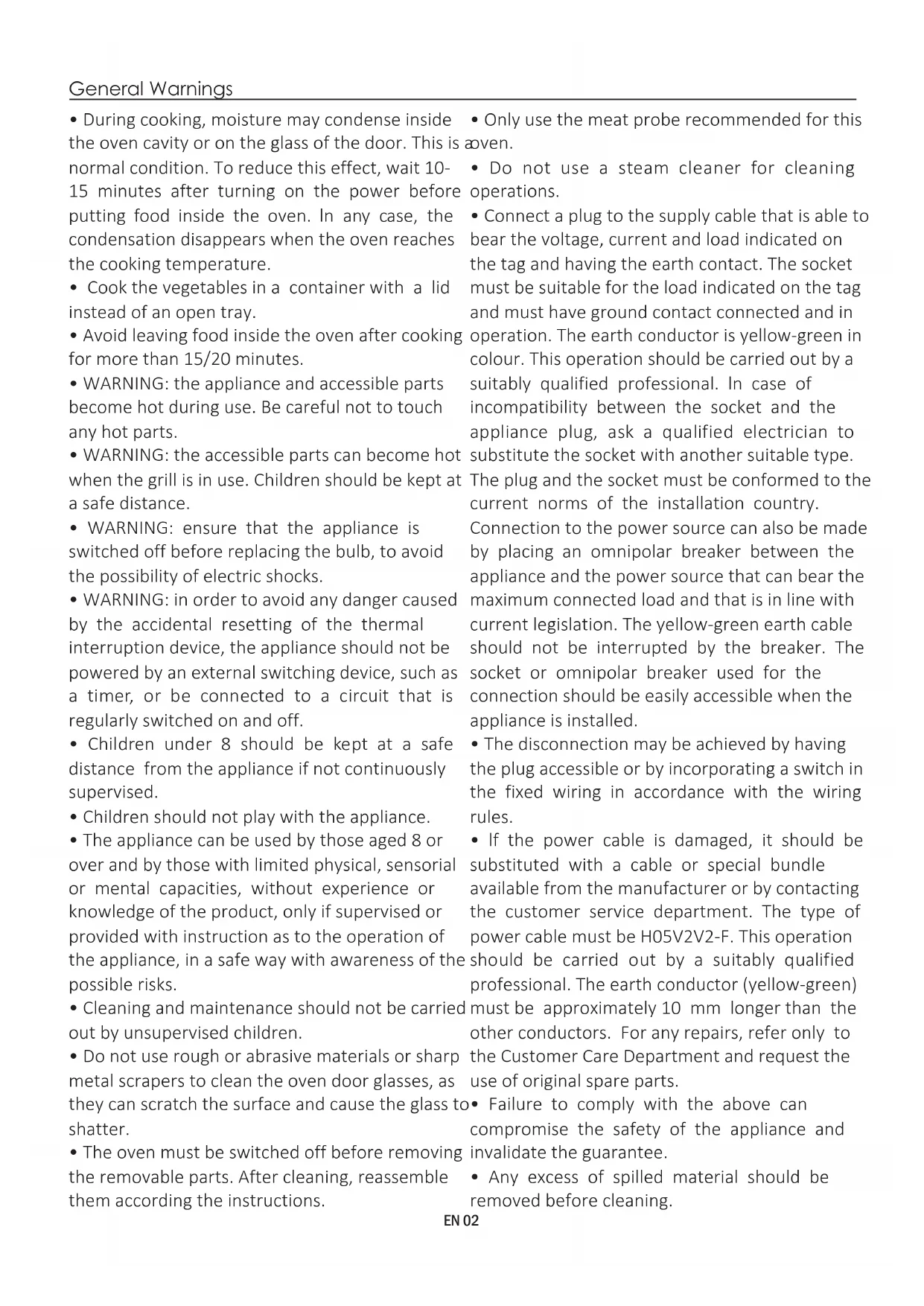 - The oven must be switched off before removing the removable parts. After cleaning, reassemble them according the instructions. EN 02• A long power supply failure during an occurring cooking phase may cause a malfunction of the monitor. ln this case contact customer service.