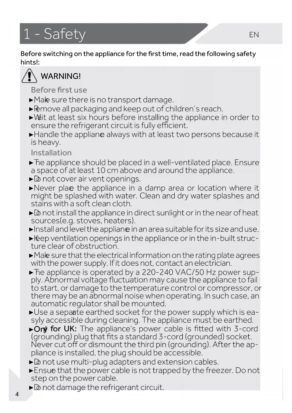 ARNING! Before rst use ▶ Mak e sure there is no transport damage. ▶ R emove all packaging and keep out of children´s reach. ▶ W ait at least six hours before installing the appliance in order to ensure the refrigerant circuit is fully ecient. ▶ Handle the applianc e always with at least two persons because it is heavy. Installation ▶ T he appliance should be placed in a well-ventilated place. Ensure a space of at least 10 cm above and around the appliance. ▶ D o not cover air vent openings. ▶ Never plac e the appliance in a damp area or location where it might be splashed with water. Clean and dry water splashes and stains with a soft clean cloth. ▶ D o not install the appliance in direct sunlight or in the near of heat sources(e.g. stoves, heaters). ▶ Install and level the applianc e in an area suitable for its size and use. ▶ K eep ventilation openings in the appliance or in the in-built struc- ture clear of obstruction. ▶ Mak e sure that the electrical information on the rating plate agrees with the power supply. If it does not, contact an electrician. ▶ T he appliance is operated by a 220-240 VAC/50 Hz power sup- ply. Abnormal voltage uctuation may cause the appliance to fail to start, or damage to the temperature control or compressor, or there may be an abnormal noise when operating. In such case, an automatic regulator shall be mounted. ▶ Use a separ ate earthed socket for the power supply which is ea- syly accessible during cleaning. The appliance must be earthed. ▶ Onl y for UK: The appliance’s power cable is tted with 3-cord (grounding) plug that ts a standard 3-cord (grounded) socket. Never cut o or dismount the third pin (grounding). After the ap- pliance is installed, the plug should be accessible. ▶ D o not use multi-plug adapters and extension cables. ▶ Ensur e that the power cable is not trapped by the freezer. Do not step on the power cable. ▶ D o not damage the refrigerant circuit.
