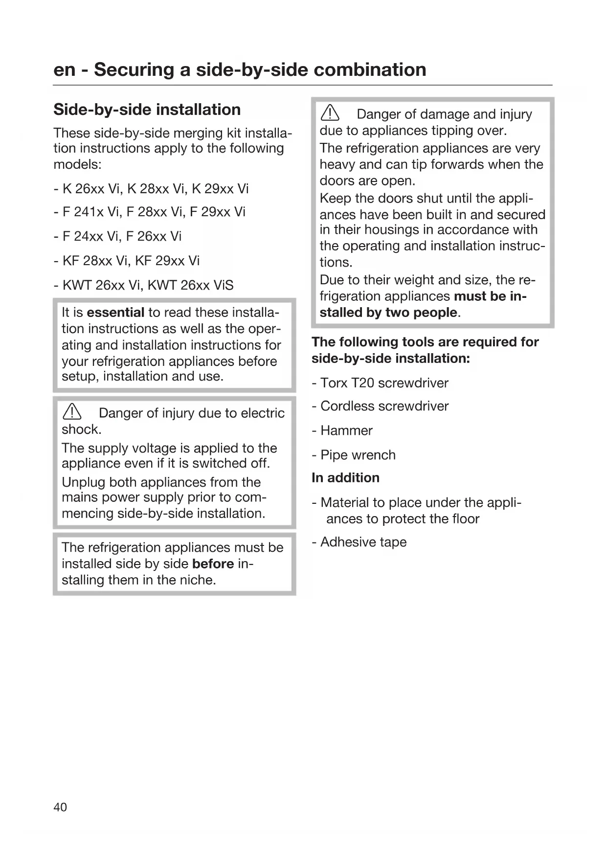 Side-by-side installation These side-by-side merging kit installa- tion instructions apply to the following models: - K26xxVi,K28xxVi,K29xxVi - F241xVi,F28xxVi,F29xxVi - F24xxVi,F26xxVi - KF28xxVi,KF29xxVi - KWT26xxVi,KWT26xx ViS It is essential to read these installa- tion instructions as well as the oper- ating and installation instructions for your refrigeration appliances before setup, installation and use. Danger of injury due to electric shock. The supply voltage is applied to the appliance even if it is switched off. Unplug both appliances from the mains power supply prior to com- mencing side-by-side installation. The refrigeration appliances must be installed side by side before in- stalling them in the niche. Danger of damage and injury due to appliances tipping over. The refrigeration appliances are very heavy and can tip forwards when the doors are open. Keep the doors shut until the appli- ances have been built in and secured in their housings in accordance with the operating and installation instruc- tions. Due to their weight and size, the re- frigeration appliances must be in- stalled by two people. The following tools are required for side-by-side installation: - Torx T20 screwdriver - Cordless screwdriver - Hammer - Pipe wrench In addition - Material to place under the appli- ances to protect the floor - Adhesive tapeen - Securing a side-by-side combination