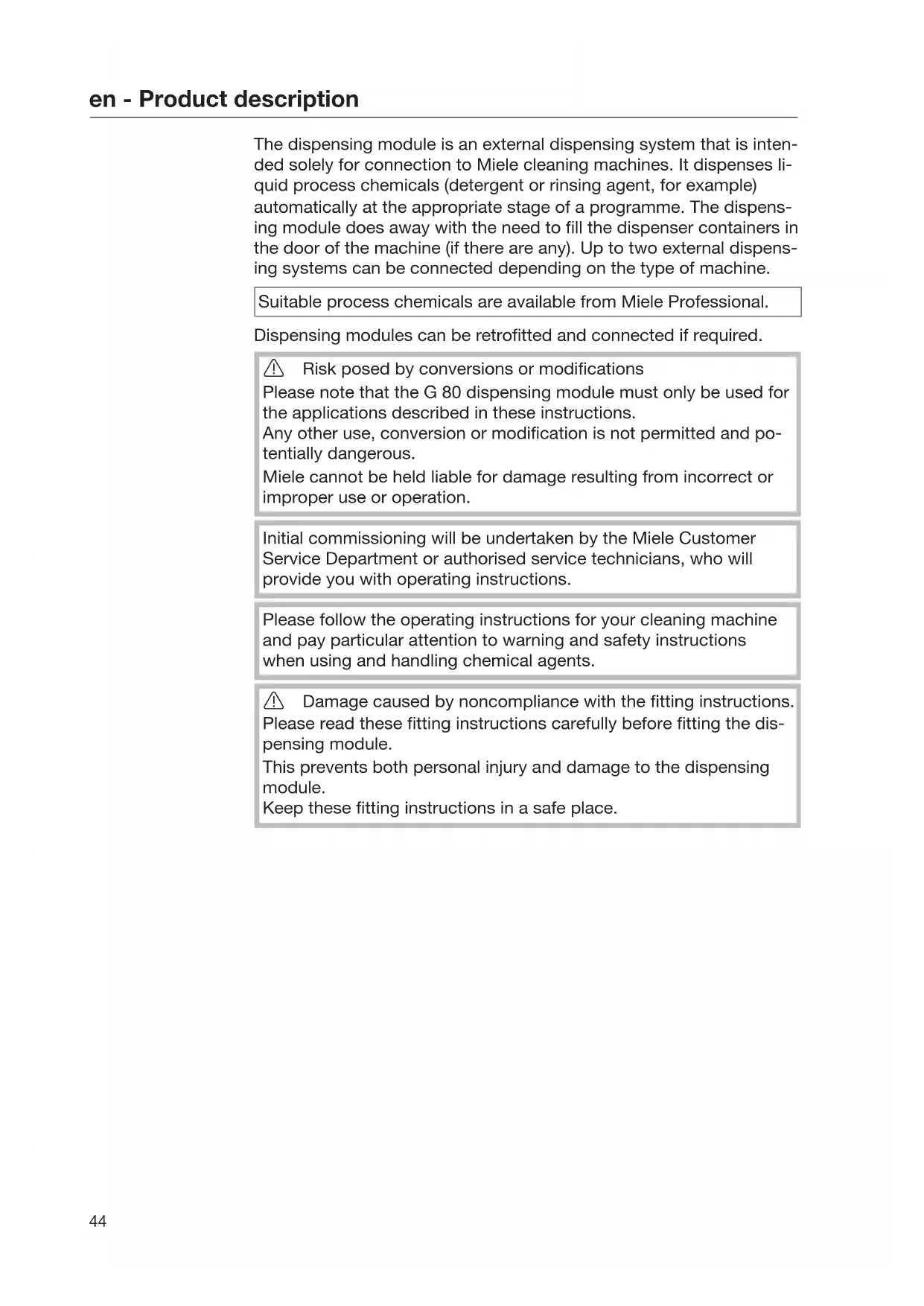 The dispensing module is an external dispensing system that is inten- ded solely for connection to Miele cleaning machines. It dispenses li- quid process chemicals (detergent or rinsing agent, for example) automatically at the appropriate stage of a programme. The dispens- ing module does away with the need to fill the dispenser containers in the door of the machine (if there are any). Up to two external dispens- ing systems can be connected depending on the type of machine. Suitable process chemicals are available from Miele Professional. Dispensing modules can be retrofitted and connected if required. Risk posed by conversions or modifications Please note that the G80 dispensing module must only be used for the applications described in these instructions. Any other use, conversion or modification is not permitted and po- tentially dangerous. Miele cannot be held liable for damage resulting from incorrect or improper use or operation. Initial commissioning will be undertaken by the Miele Customer Service Department or authorised service technicians, who will provide you with operating instructions. Please follow the operating instructions for your cleaning machine and pay particular attention to warning and safety instructions when using and handling chemical agents. Damage caused by noncompliance with the fitting instructions. Please read these fitting instructions carefully before fitting the dis- pensing module. This prevents both personal injury and damage to the dispensing module. Keep these fitting instructions in a safe place.en - Product description