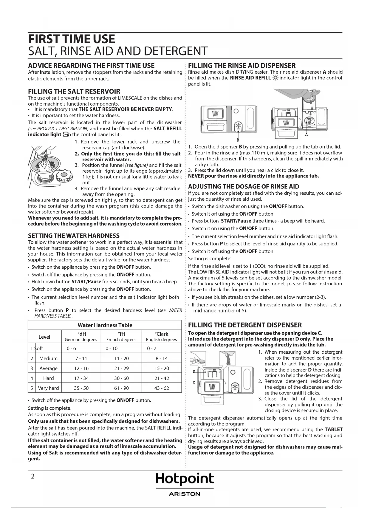 - Press button P to select the desired hardness level (see WATER HARDNESS TABLE).• Switch o the appliance by pressing the ON/OFF button.Setting is complete!As soon as this procedure is complete, run a program without loading.Only use salt that has been specically designed for dishwashers.After the salt has been poured into the machine, the SALT REFILL indi-cator light switches o.If the salt container is not lled, the water softener and the heating element may be damaged as a result of limescale accumulation.Using of Salt is recommended with any type of dishwasher deter-gent. Water Hardness Table Level °dH German degrees °fH French degrees°Clark English degrees1 Soft 0 - 6 0 - 10 0 - 7 2 Medium 7 - 11 11 - 20 8 - 14 3 Average 12 - 16 21 - 29 15 - 20 4 Hard 17 - 34 30 - 60 21 - 42 5 Very hard 35 - 50 61 - 90 43 - 62