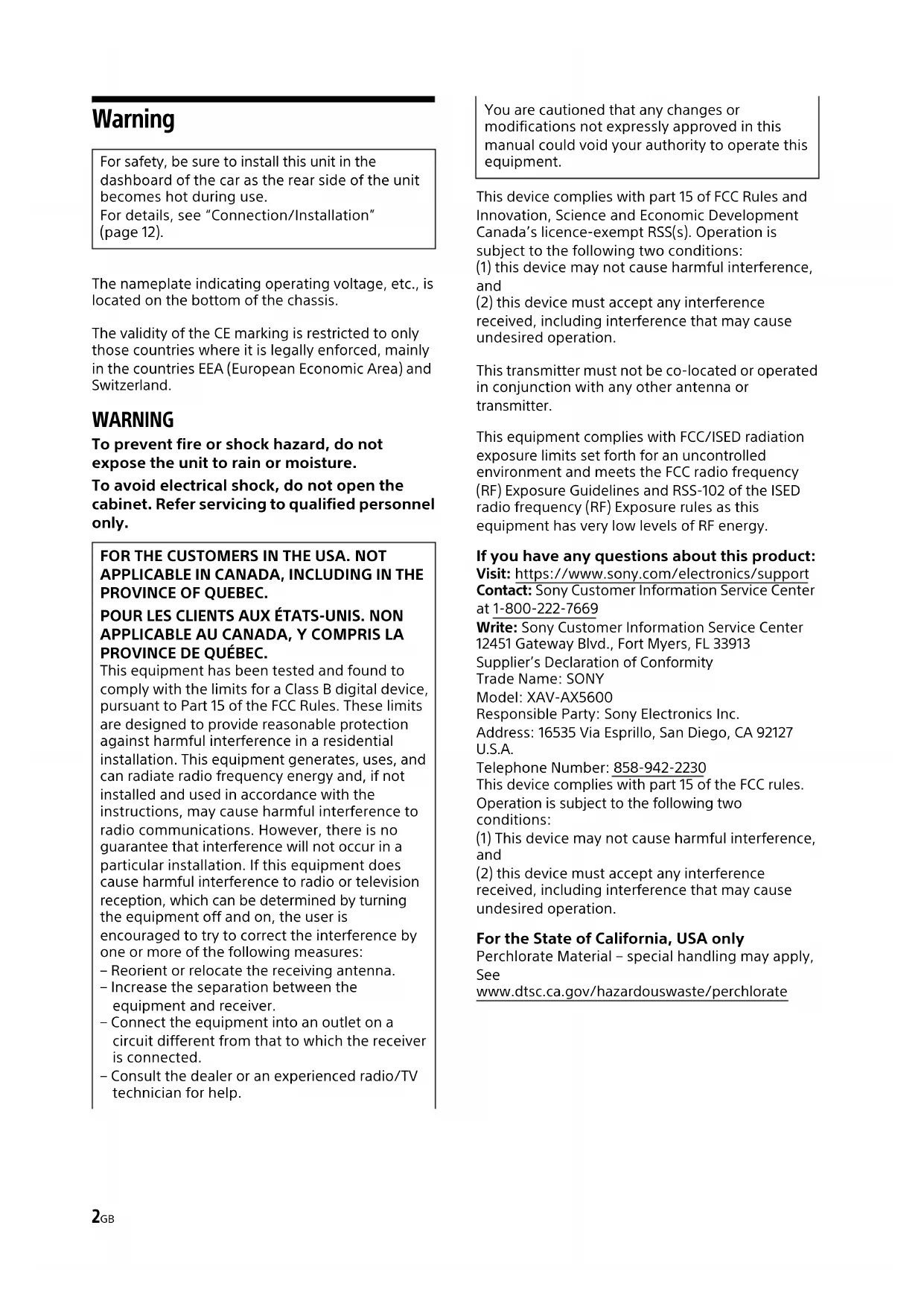 To cancel the demonstration (Demo) display, see page 7.Pour annuler l’affichage de démonstration (Démo), reportez-vous à la page 7.Para cancelar la pantalla de demostración (Demostración), consulte la página 7.2GB Warning The nameplate indicating operating voltage, etc., is located on the bottom of the chassis. The validity of the CE marking is restricted to only those countries where it is legally enforced, mainly in the countries EEA (European Economic Area) and Switzerland. WARNING To prevent fire or shock hazard, do not expose the unit to rain or moisture. To avoid electrical shock, do not open the cabinet. Refer servicing to qualified personnel only. This device complies with part 15 of FCC Rules and Innovation, Science and Economic Development Canada’s licence-exempt RSS(s). Operation is subject to the following two conditions: (1) this device may not cause harmful interference, and (2) this device must accept any interference received, including interference that may cause undesired operation. This transmitter must not be co-located or operated in conjunction with any other antenna or transmitter. This equipment complies with FCC/ISED radiation exposure limits set forth for an uncontrolled environment and meets the FCC radio frequency (RF) Exposure Guidelines and RSS-102 of the ISED radio frequency (RF) Exposure rules as this equipment has very low levels of RF energy. If you have any questions about this product: Visit: https://www.sony.com/electronics/support Contact: Sony Customer Information Service Center at 1-800-222-7669 Write: Sony Customer Information Service Center 12451 Gateway Blvd., Fort Myers, FL 33913 Supplier’s Declaration of Conformity Trade Name: SONY Model: XAV-AX5600 Responsible Party: Sony Electronics Inc. Address: 16535 Via Esprillo, San Diego, CA 92127 U.S.A. Telephone Number: 858-942-2230 This device complies with part 15 of the FCC rules. Operation is subject to the following two conditions: (1) This device may not cause harmful interference, and (2) this device must accept any interference received, including interference that may cause undesired operation. For the State of California, USA only Perchlorate Material – special handling may apply, See www.dtsc.ca.gov/hazardouswaste/perchlorate For safety, be sure to install this unit in the dashboard of the car as the rear side of the unit becomes hot during use. For details, see “Connection/Installation” (page 12). FOR THE CUSTOMERS IN THE USA. NOT