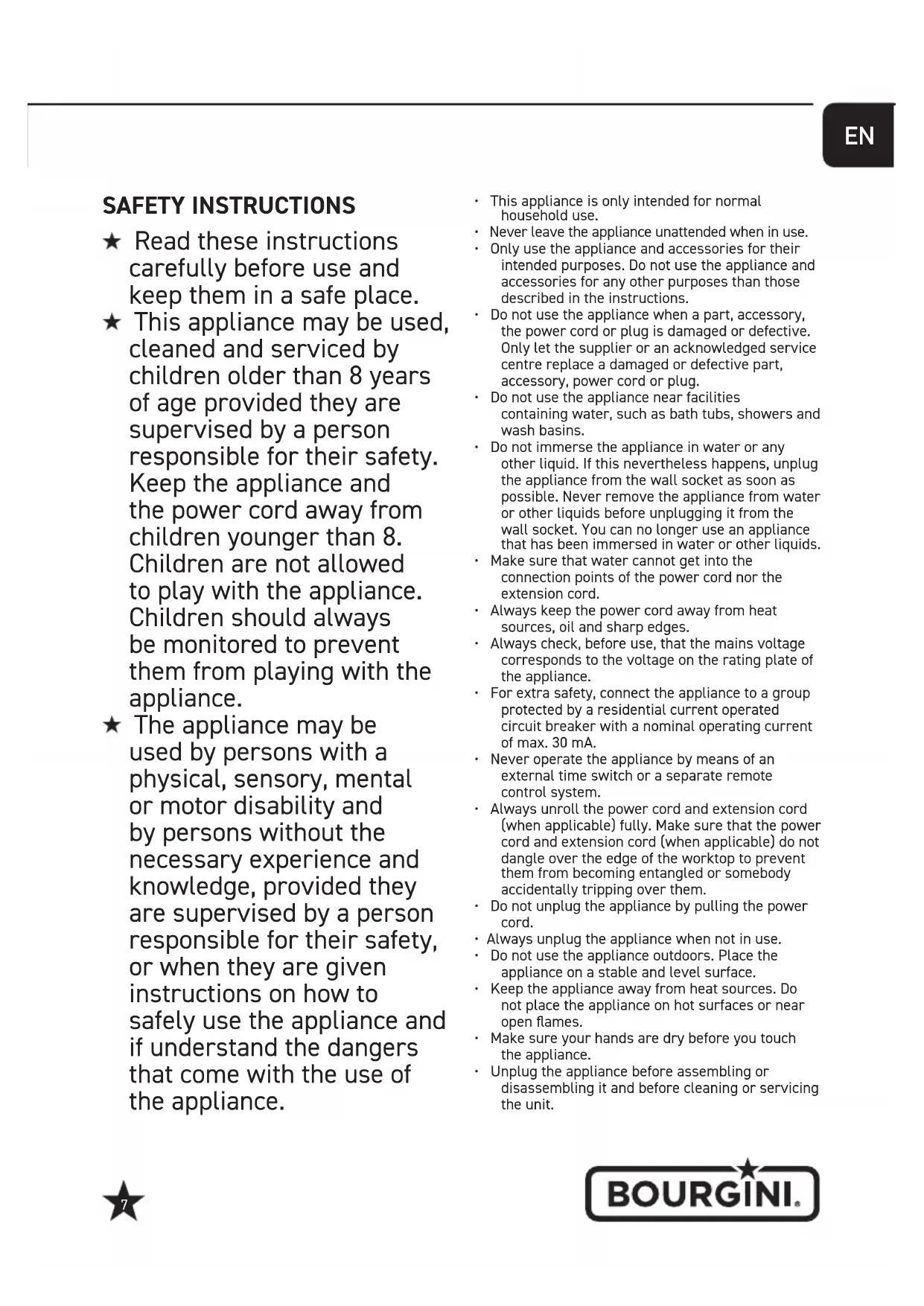 - Unplug the appliance before assembling or disassembling it and before cleaning or servicing the unit. EN8