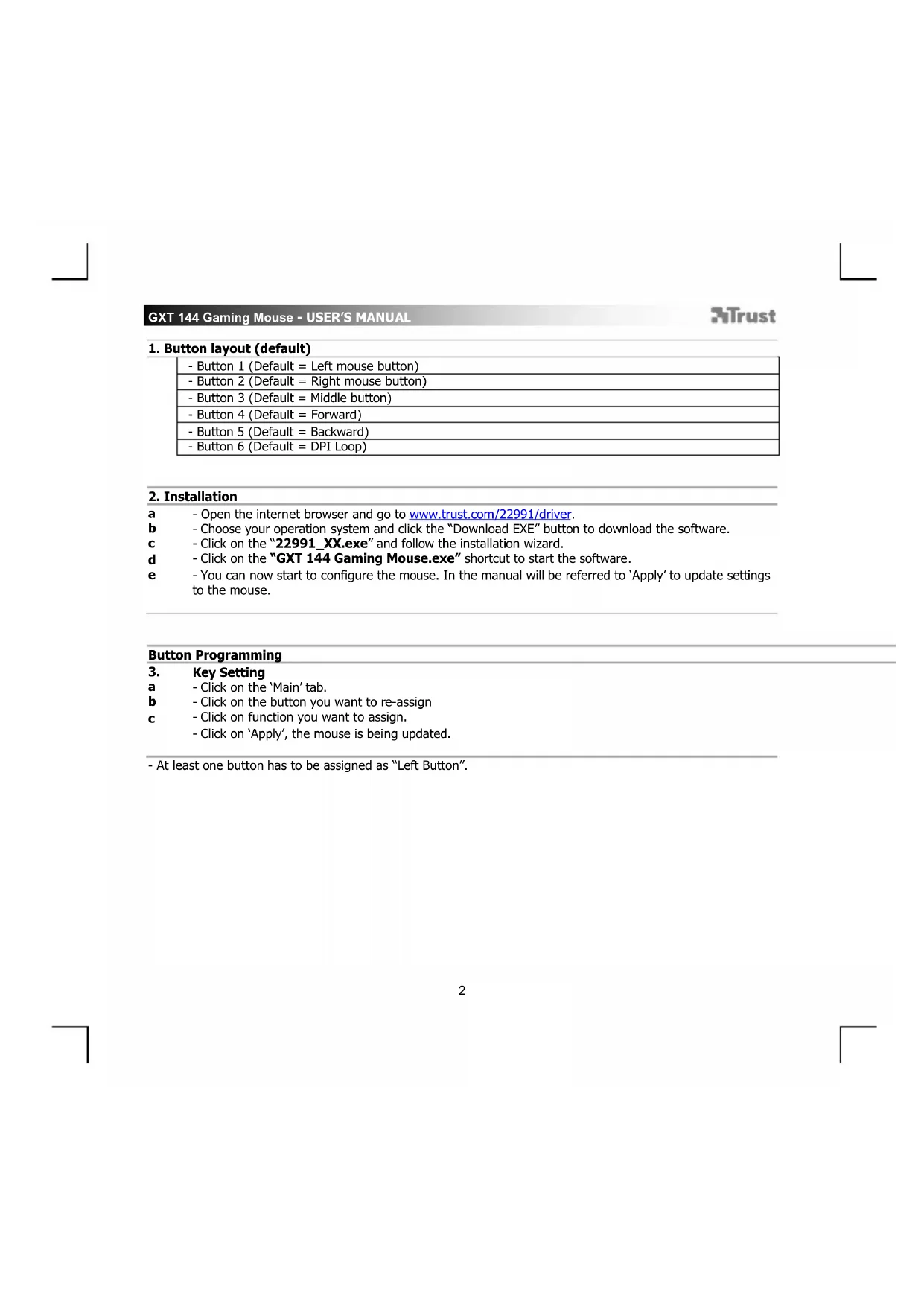 - At least one button has to be assigned as “Left Button”.GXT 144 Gaming Mouse - USER’S MANUAL