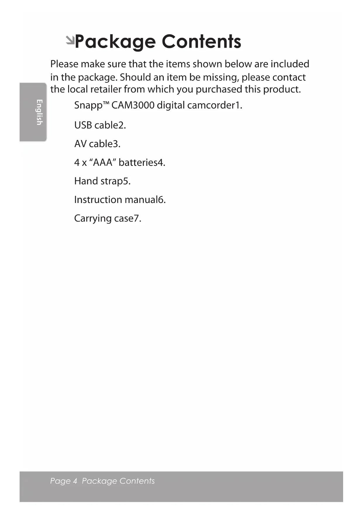 Please make sure that the items shown below are included in the package. Should an item be missing, please contact the local retailer from which you purchased this product. Snapp™ CAM3000 digital camcorder1. USB cable2. AV cable3. 4 x “AAA” batteries4. Hand strap5. Instruction manual6. Carrying case7.English Page 5 Features Features