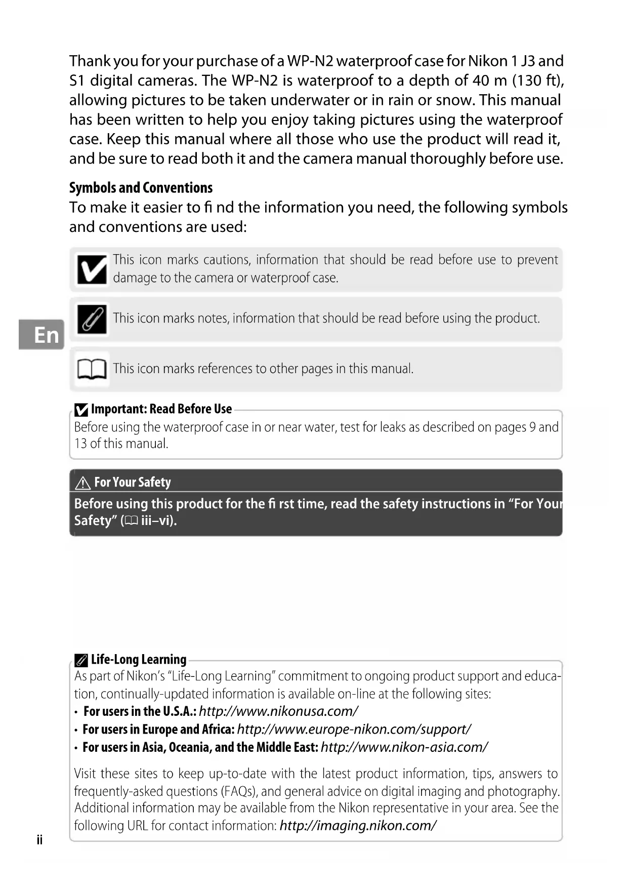 Thank you for your purchase of a WP-N2 waterproof case for Nikon 1 J3 and S1 digital cameras. The WP-N2 is waterproof to a depth of 40 m (130 ft), allowing pictures to be taken underwater or in rain or snow. This manual has been written to help you enjoy taking pictures using the waterproof case. Keep this manual where all those who use the product will read it, and be sure to read both it and the camera manual thoroughly before use. Symbols and Conventions To make it easier to fi nd the information you need, the following symbols and conventions are used: This icon marks cautions, information that should be read before use to prevent damage to the camera or waterproof case. This icon marks notes, information that should be read before using the product. This icon marks references to other pages in this manual.