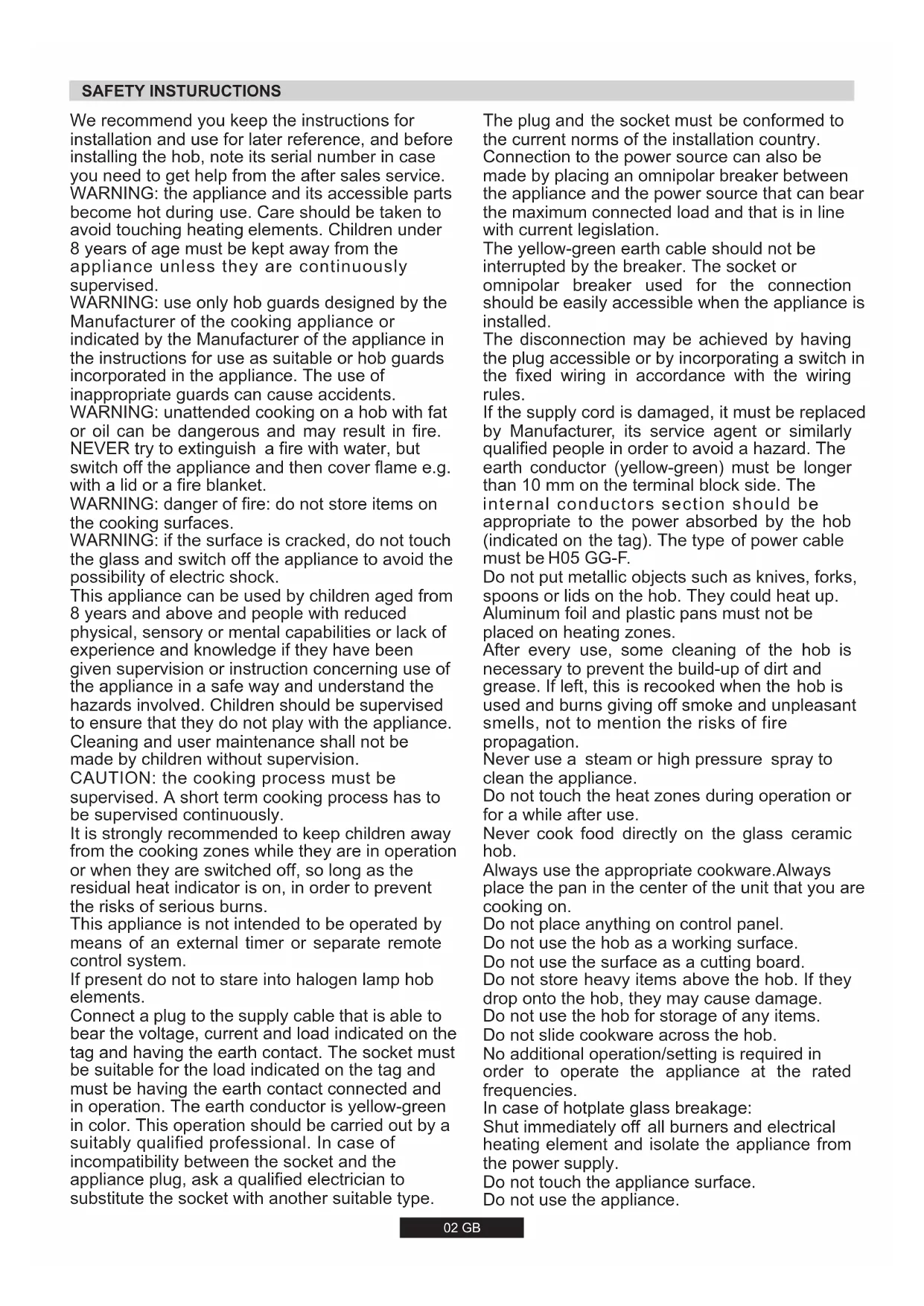 CANDY HOOVER GROUP S.R.L. • Via Comolli 16 • 20861 Brugherio (MB) Italy SK 6002 GB SAFETY INSTURUCTIONS We recommend you keep the instructions for installation and use for later reference, and before installing the hob, note its serial number in case you need to get help from the after sales service. If present do not to stare into halogen lamp hob elements. CAUTION: the cooking process must be supervised. A short term cooking process has to be supervised continuously. It is strongly recommended to keep children away from the cooking zones while they are in operation or when they are switched off, so long as the residual heat indicator is on, in order to prevent the risks of serious burns. Connect a plug to the supply cable that is able to bear the voltage, current and load indicated on the tag and having the earth contact. The socket must be suitable for the load indicated on the tag and must be having the earth contact connected and in operation. The earth conductor is yellow-green in color. This operation should be carried out by a suitably qualified professional. In case of incompatibility between the socket and the appliance plug, ask a qualified electrician to substitute the socket with another suitable type.