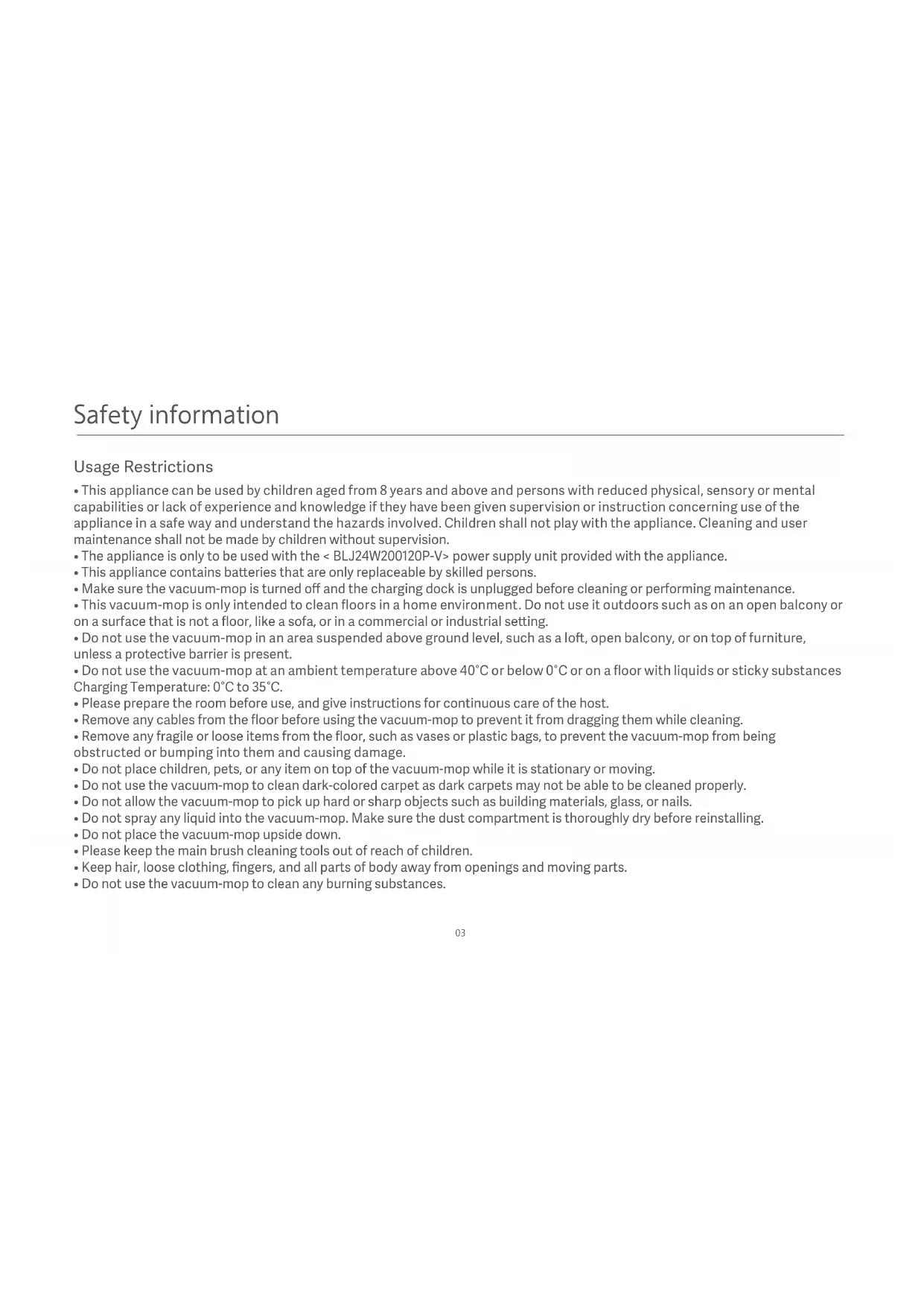 - Do not use the vacuum-mop at an ambient temperature above 40°C or below 0°C or on a floor with liquids or sticky substances Charging Temperature: 0°C to 35°C.