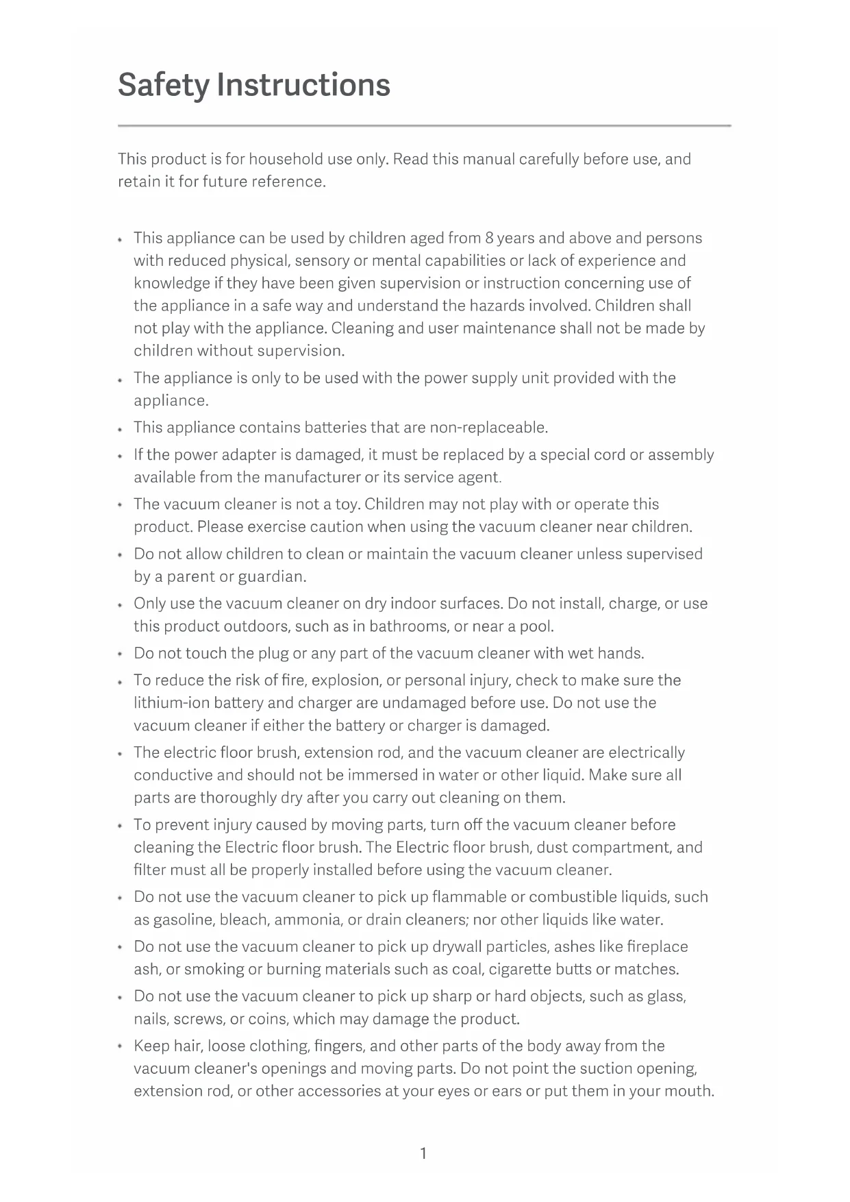 Safety Instructions This appliance can be used by children aged from 8 years and above and persons with reduced physical, sensory or mental capabilities or lack of experience and knowledge if they have been given supervision or instruction concerning use of the appliance in a safe way and understand the hazards involved. Children shall not play with the appliance. Cleaning and user maintenance shall not be made by children without supervision. The appliance is only to be used with the power supply unit provided with the appliance. This appliance contains baeries that are non-replaceable. If the power adapter is damaged, it must be replaced by a special cord or assembly available from the manufacturer or its service agent. The vacuum cleaner is not a toy. Children may not play with or operate this product. Please exercise caution when using the vacuum cleaner near children. Do not allow children to clean or maintain the vacuum cleaner unless supervised by a parent or guardian. Only use the vacuum cleaner on dry indoor surfaces. Do not install, charge, or use this product outdoors, such as in bathrooms, or near a pool. Do not touch the plug or any part of the vacuum cleaner with wet hands. To reduce the risk of fire, explosion, or personal injury, check to make sure the lithium-ion baery and charger are undamaged before use. Do not use the vacuum cleaner if either the baery or charger is damaged. The electric floor brush, extension rod, and the vacuum cleaner are electrically conductive and should not be immersed in water or other liquid. Make sure all parts are thoroughly dry aer you carry out cleaning on them. To prevent injury caused by moving parts, turn off the vacuum cleaner before cleaning the Electric floor brush. The Electric floor brush, dust compartment, and filter must all be properly installed before using the vacuum cleaner. Do not use the vacuum cleaner to pick up flammable or combustible liquids, such as gasoline, bleach, ammonia, or drain cleaners; nor other liquids like water. Do not use the vacuum cleaner to pick up drywall particles, ashes like fireplace ash, or smoking or burning materials such as coal, cigaree bus or matches. Do not use the vacuum cleaner to pick up sharp or hard objects, such as glass, nails, screws, or coins, which may damage the product. Keep hair, loose clothing, fingers, and other parts of the body away from the vacuum cleaner's openings and moving parts. Do not point the suction opening, extension rod, or other accessories at your eyes or ears or put them in your mouth. This product is for household use only. Read this manual carefully before use, and retain it for future reference.Do not put any object into the vacuum cleaner's openings, nor use the vacuum cleaner with any opening blocked. Keep free of dust, lint, hair, or other items which may reduce airflow. Do not rest the vacuum cleaner against a chair, table, or other unstable surfaces, as this may cause damage to the product or personal injury. If the vacuum cleaner malfunctions because of being knocked over or damaged, please contact the authorized service department. Never aempt to disassemble the vacuum cleaner on your own. Only use the original charger to charge the product in environments with an ambient temperature of 0°C to 35°C. Otherwise, the baery may damage. The dust compartment, filter coon, cyclone separator, and filter must all be properly installed prior to using the vacuum cleaner. Make sure the vacuum cleaner is unplugged when not used for extended periods as well as prior to performing any maintenance or repairs. Please be extra careful when using the vacuum cleaner to clean stairs.